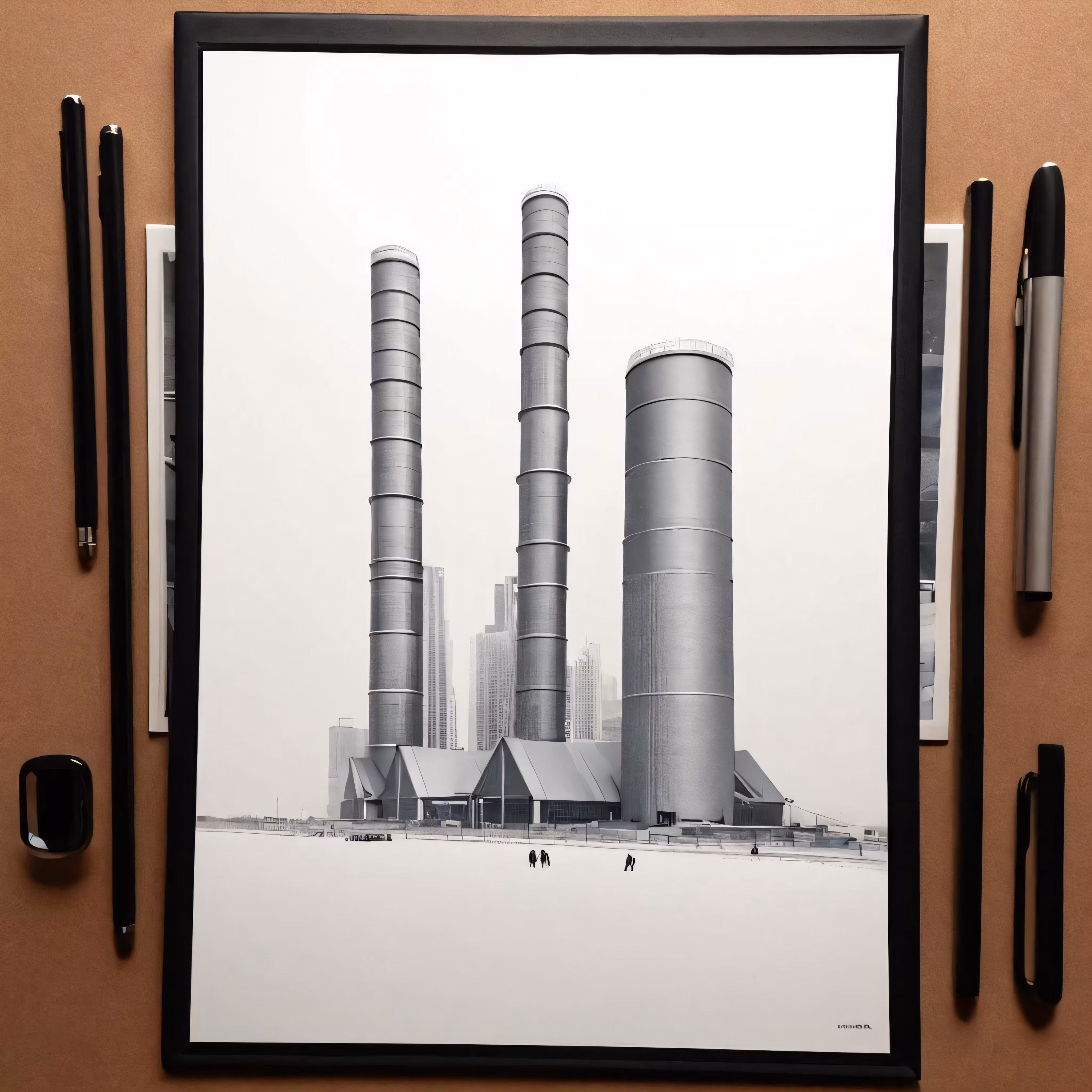 High resolution picture, free to use, an art work with two steel towers in front of buildings