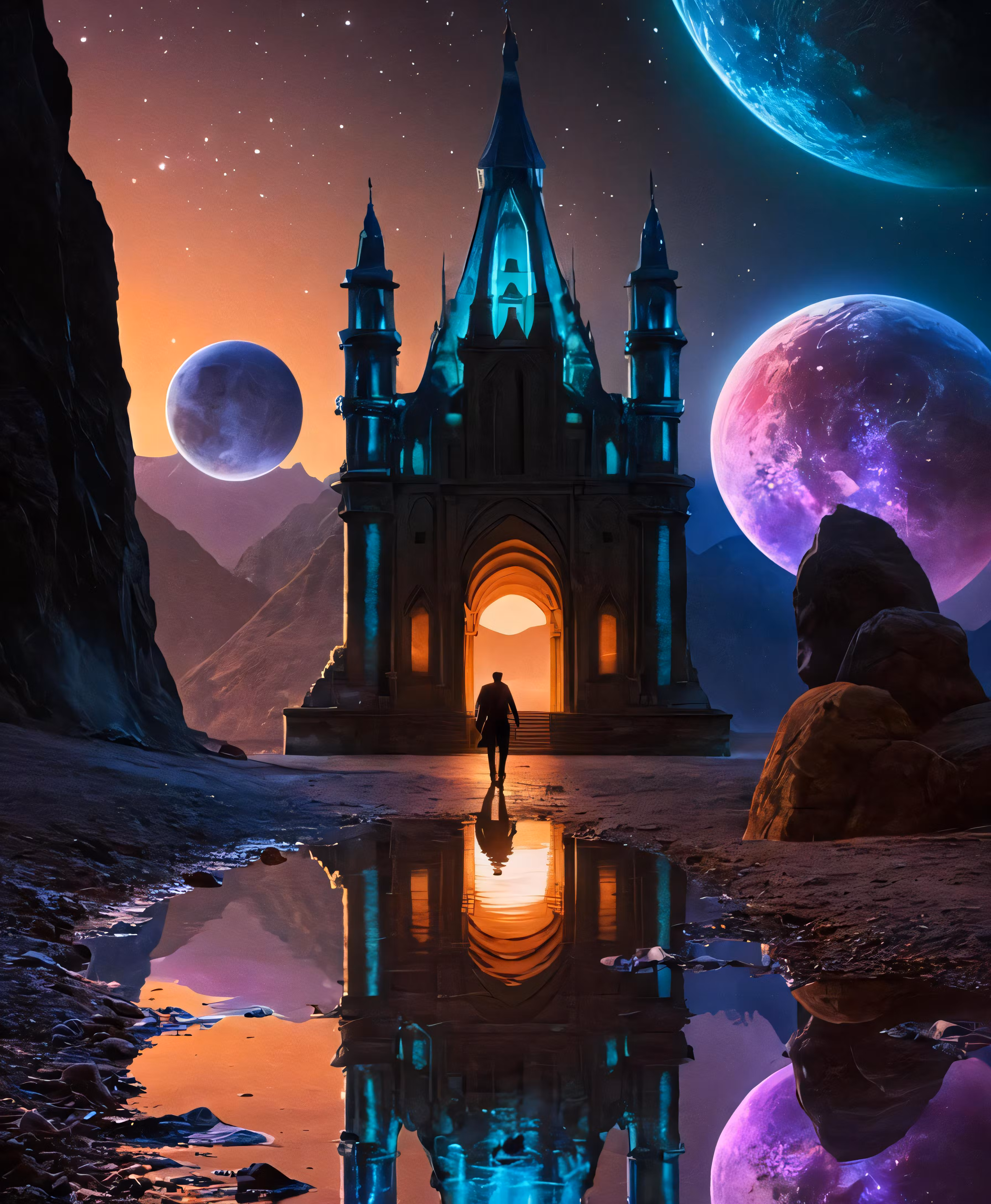 High resolution picture, free to use, an artist rendering of a castle with colorful lights