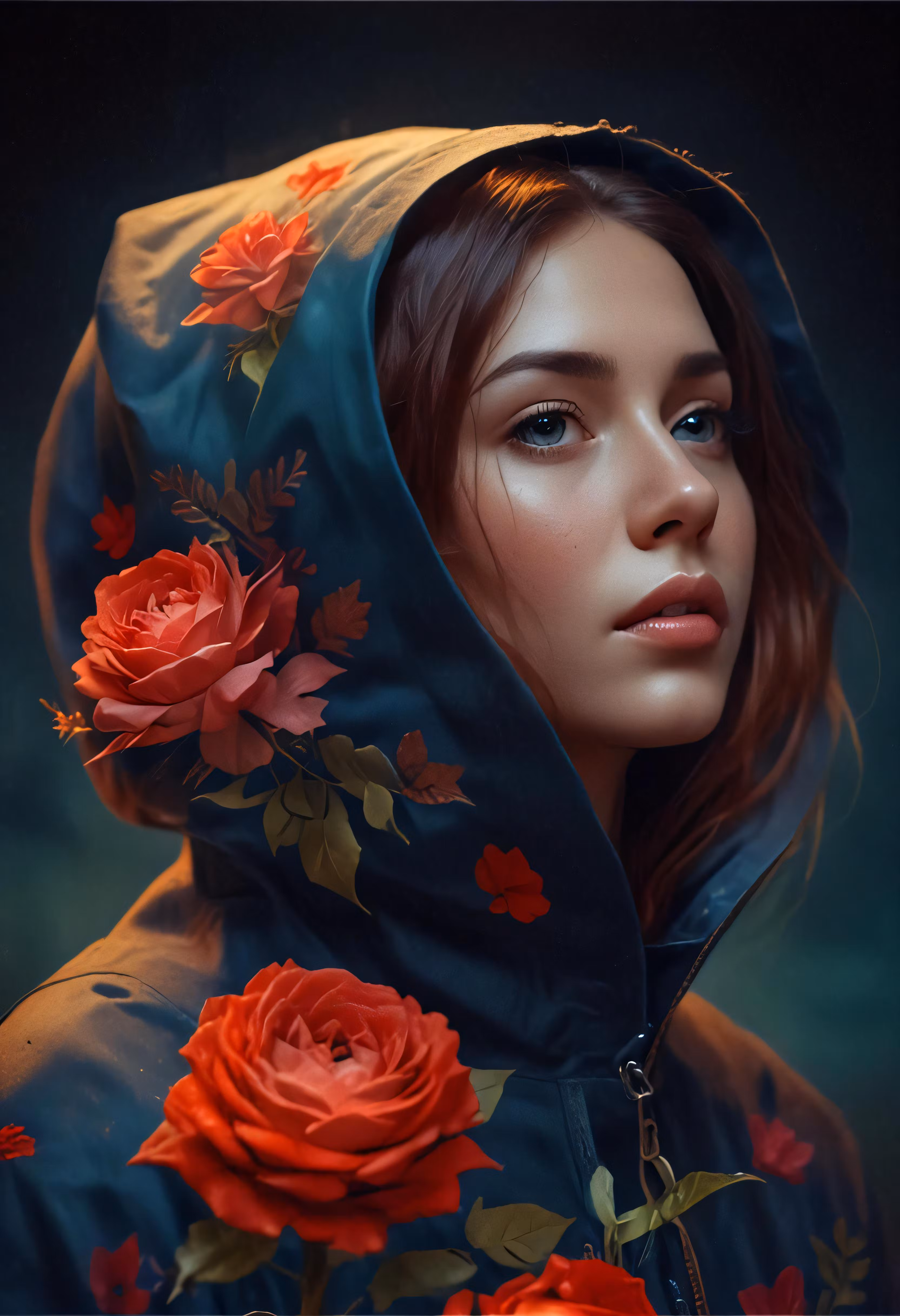 High resolution picture, free to use, an artist rendering of a girl wearing a hoodie with red flowers on it