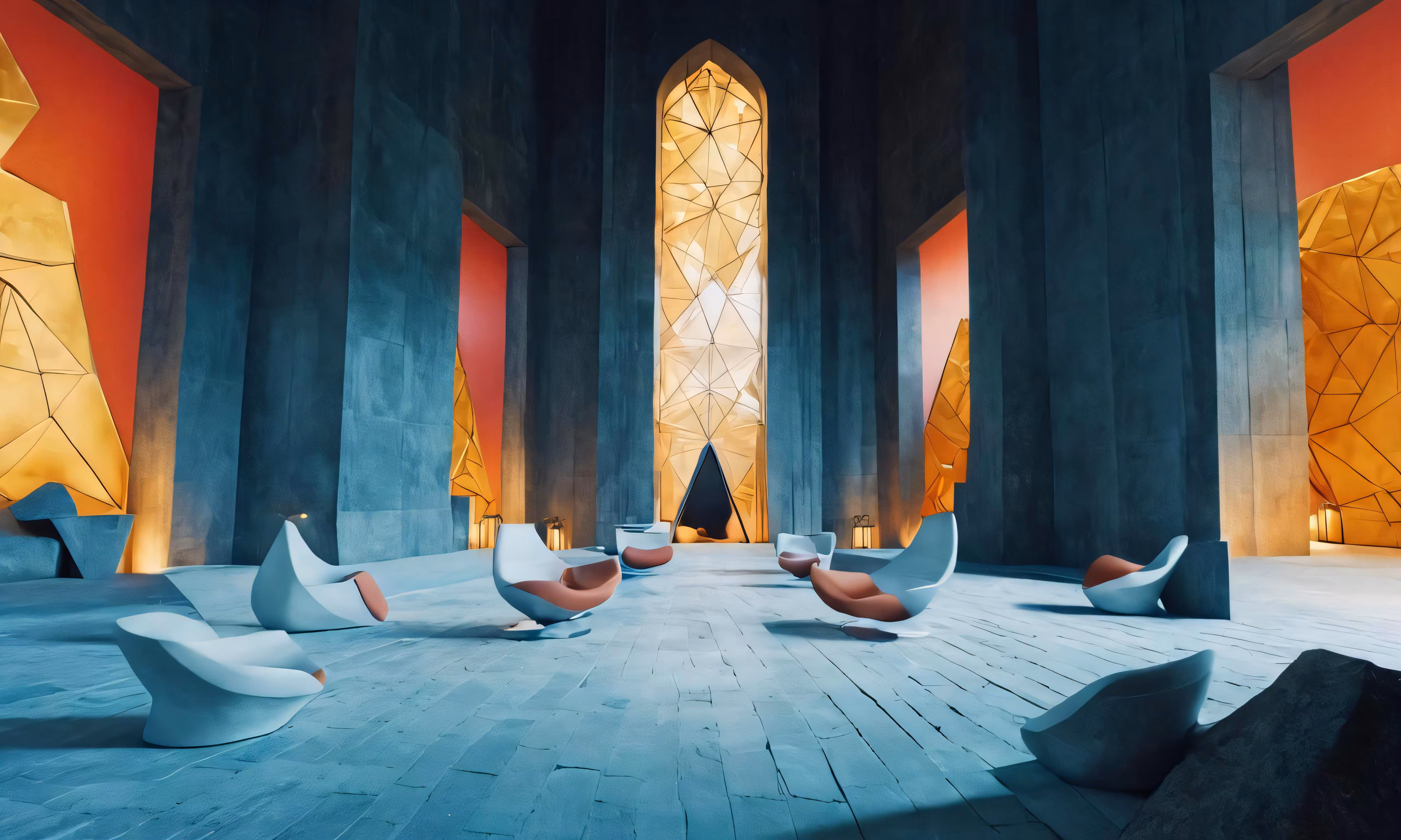 High resolution picture, free to use, an artistic, modern room with various objects on the floor
