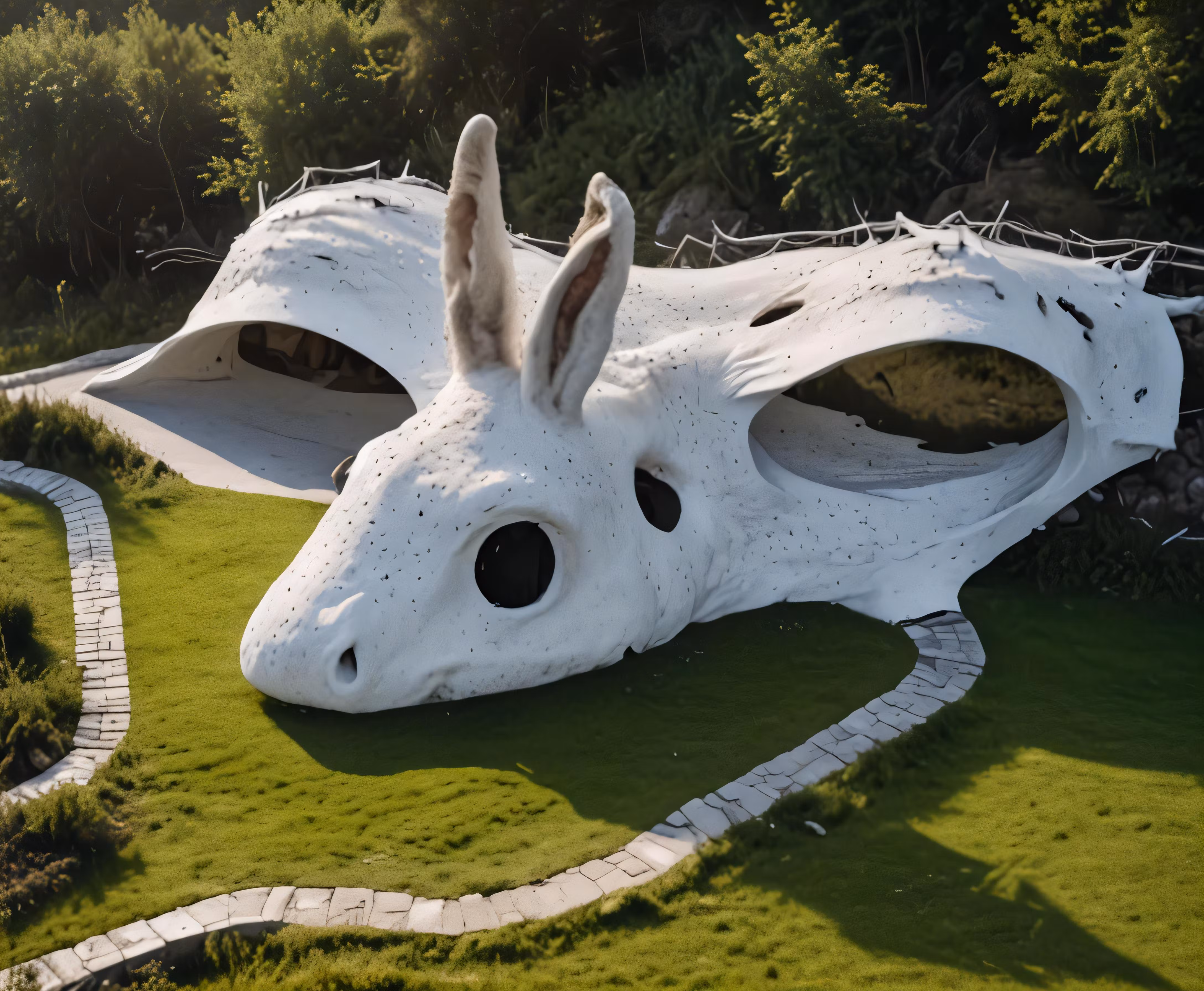 High resolution picture, free to use, an artistic design on the grass with a large white animal head