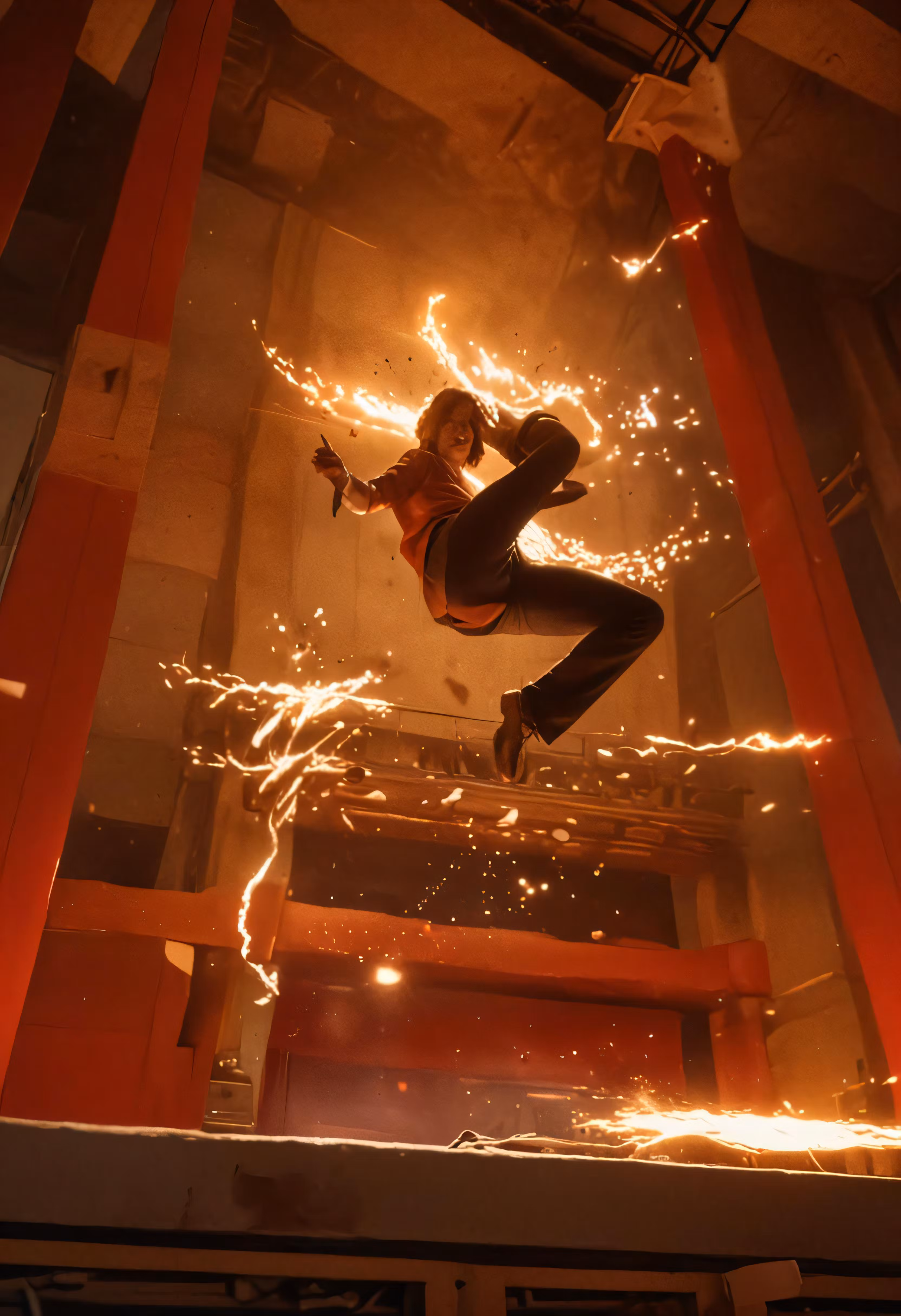 High resolution picture, free to use, an artistic fashion shot shows a woman leaping through the air