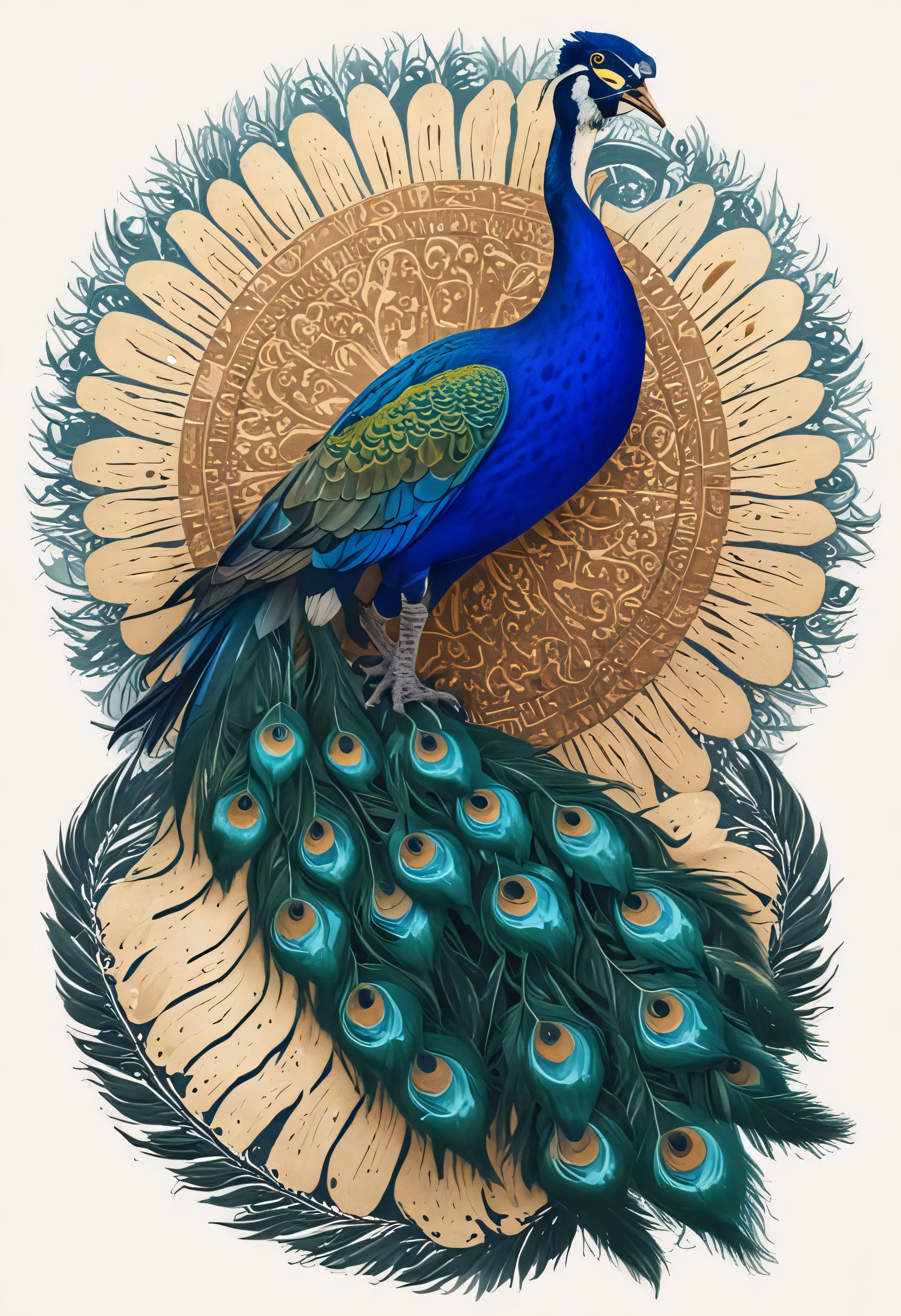 High resolution picture, free to use, an artistic illustration of a peacock and feathers on a sunburst