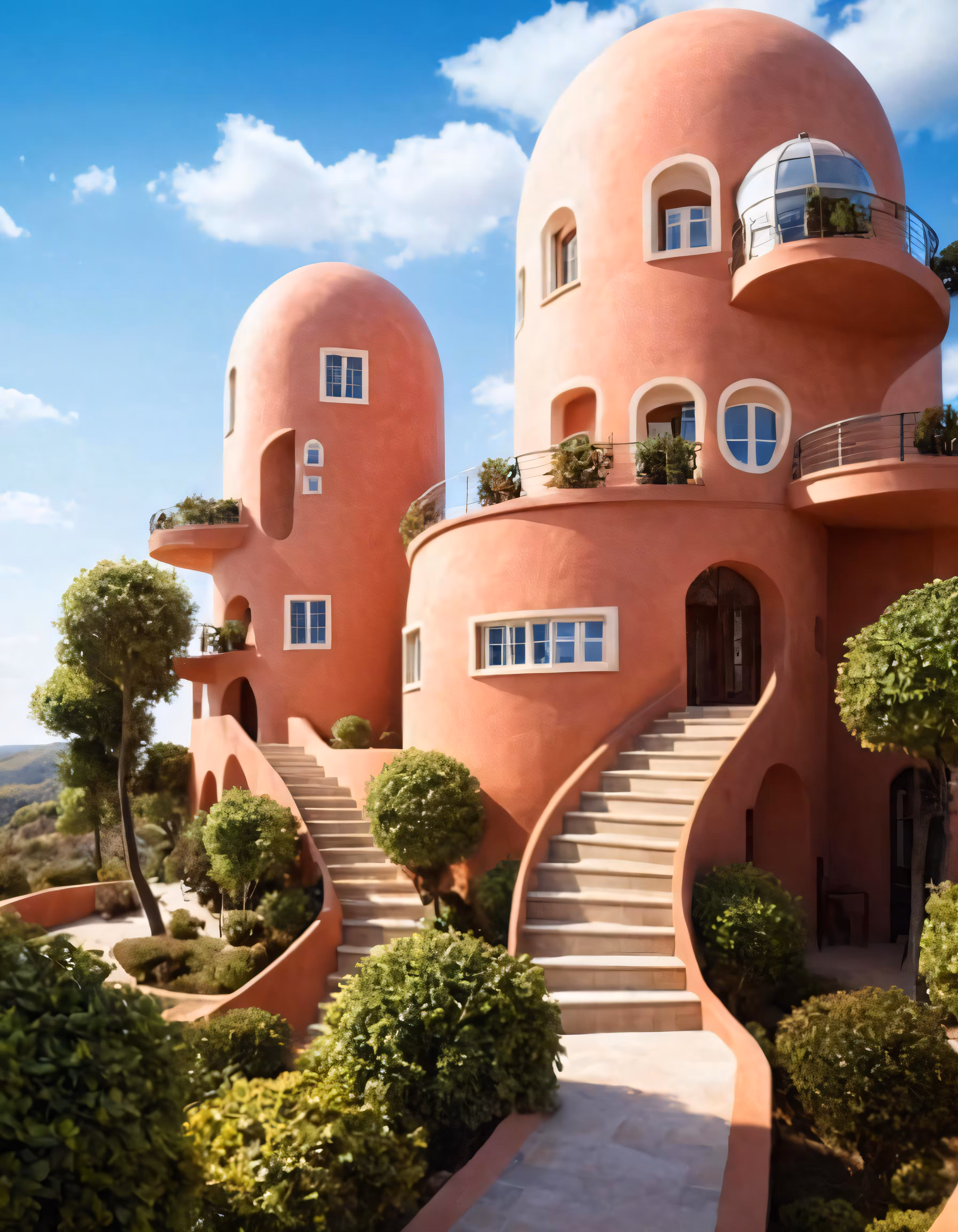 High resolution picture, free to use, an artistic image of a pink building with stairs