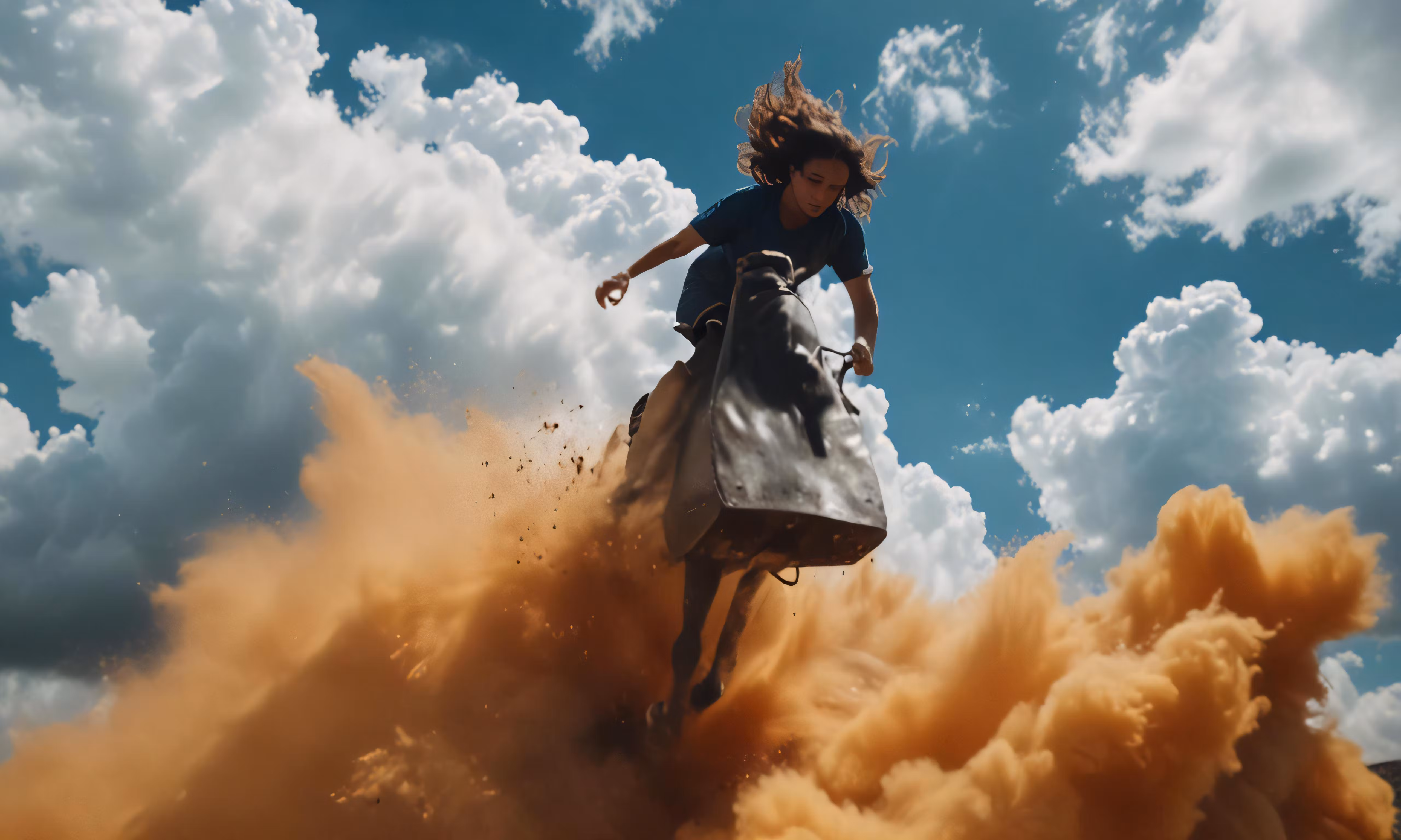 High resolution picture, free to use, an artistic image of a woman riding a horse and exploding it with dust