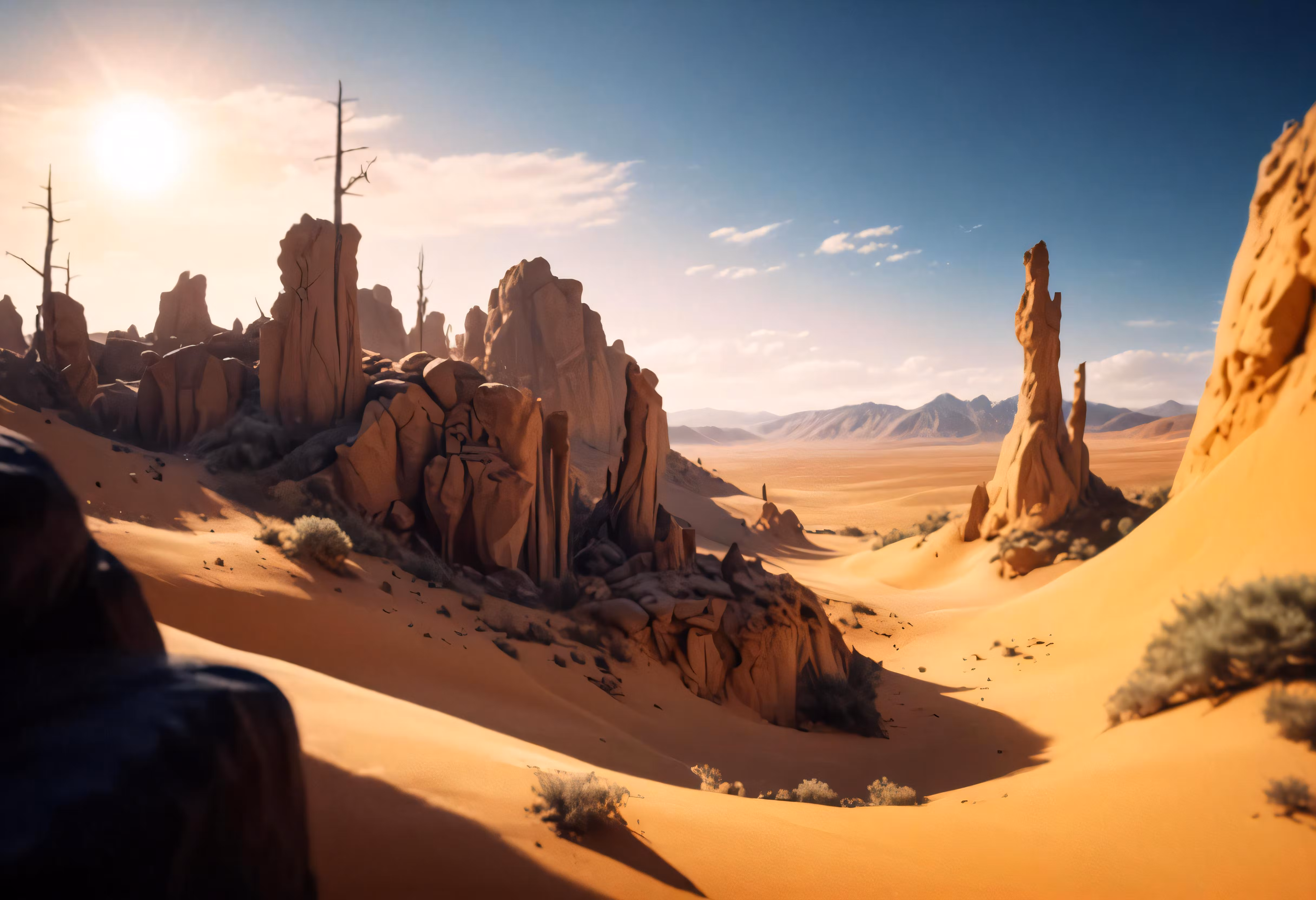 High resolution picture, free to use, an artistic image shows desert landscape with large rock formations