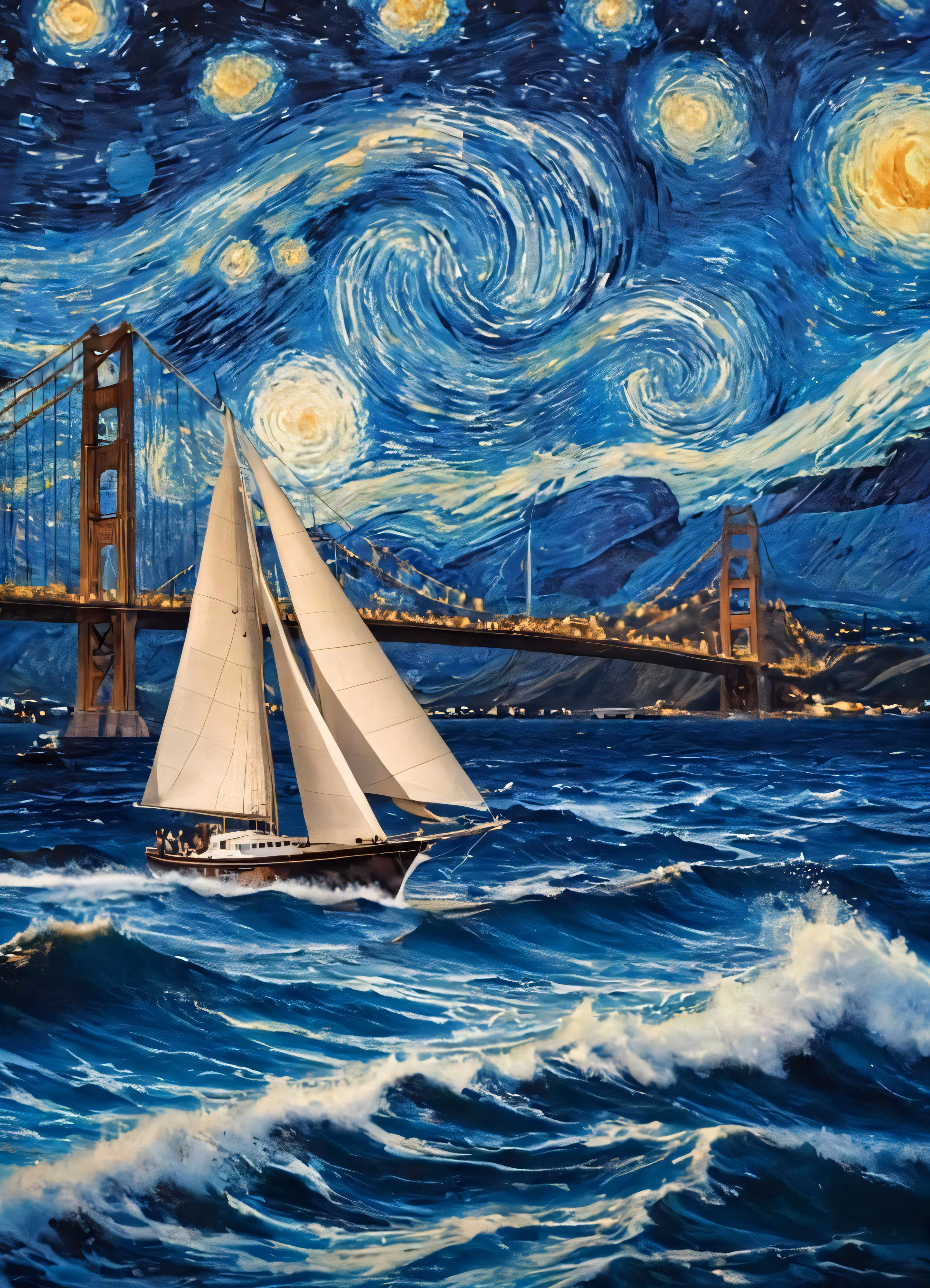 High resolution picture, free to use, an artistic painting of a boat under the golden gate bridge