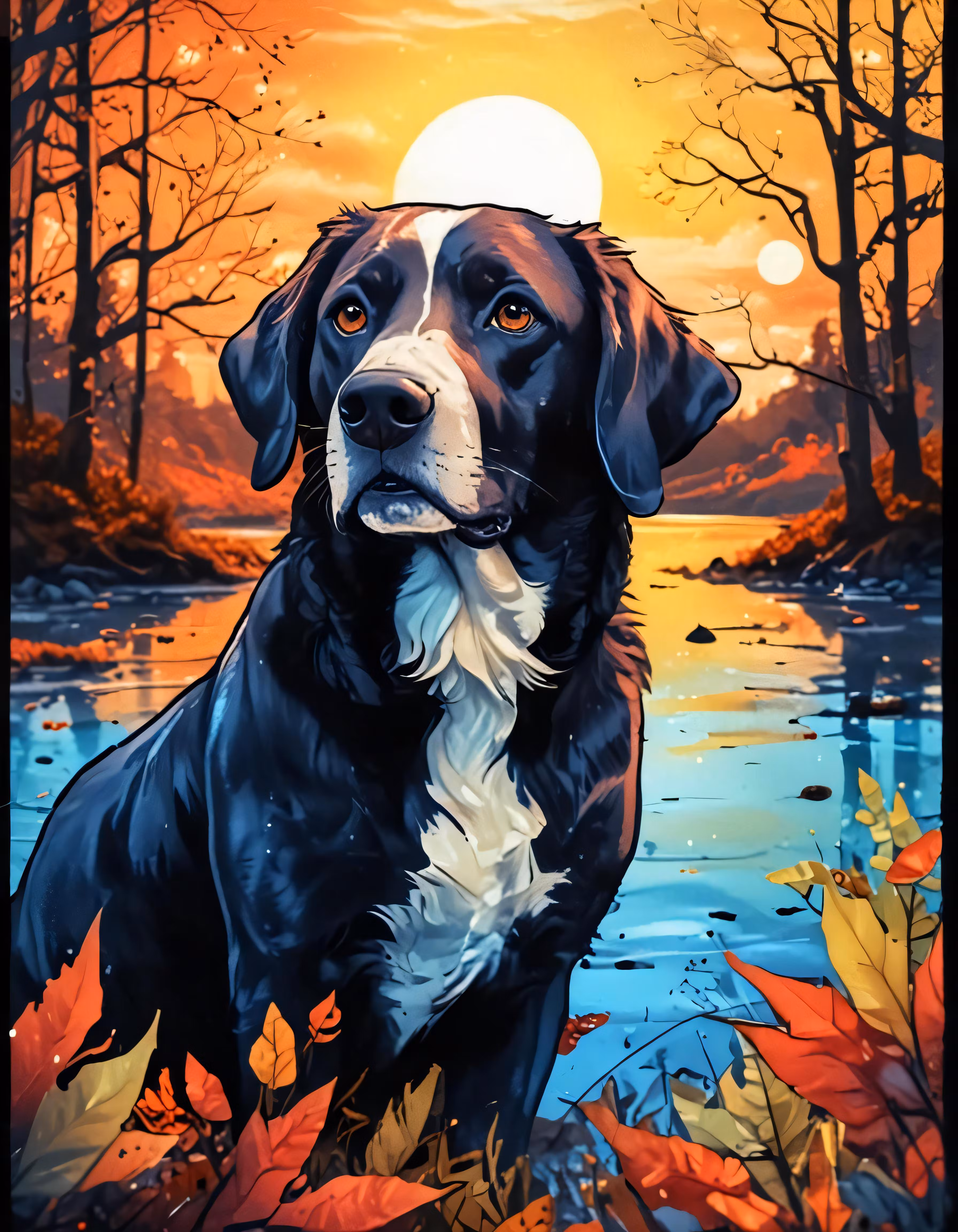 High resolution picture, free to use, an artistic painting of a dog sitting in front of a pond
