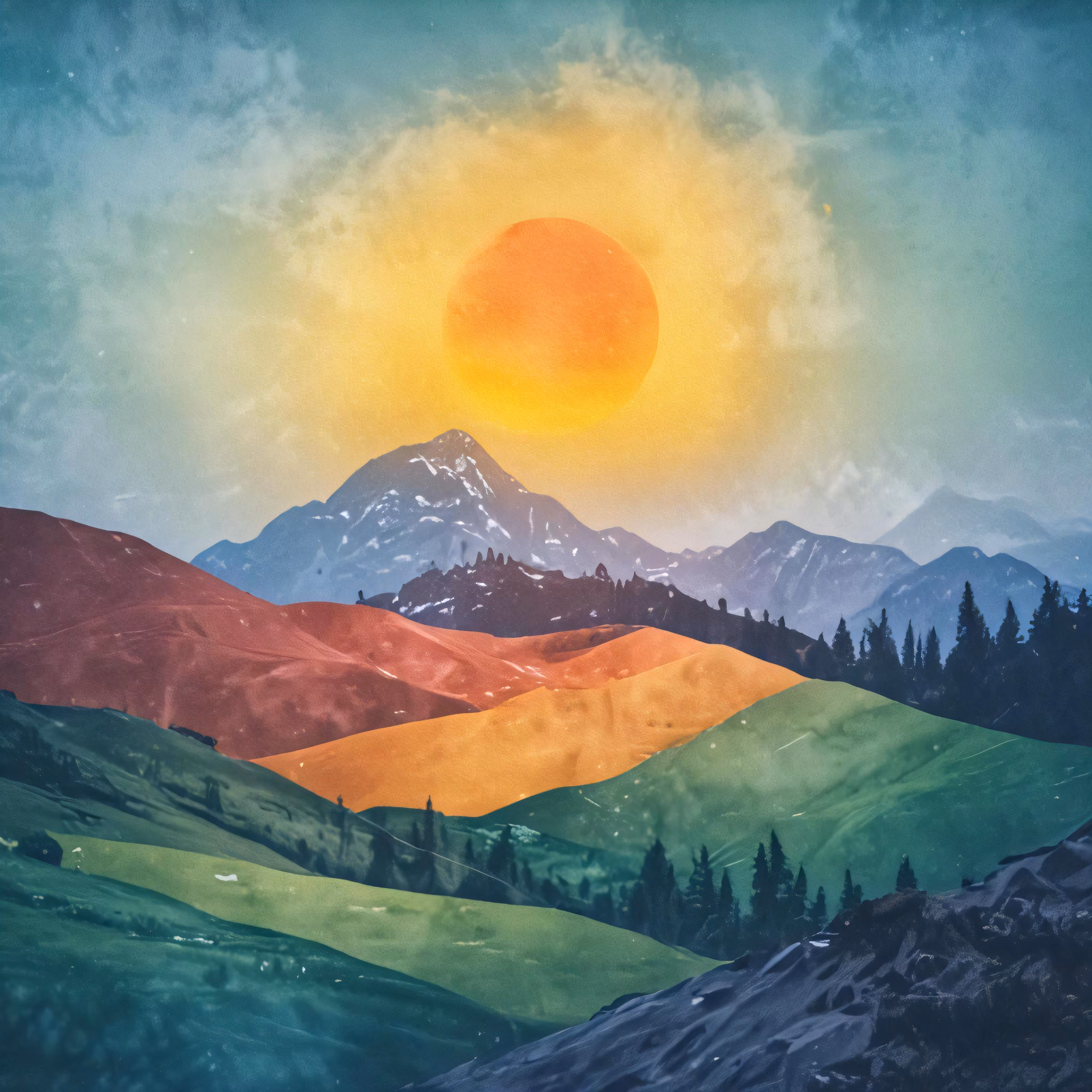 High resolution picture, free to use, an artistic painting of mountains with a bright orange sun