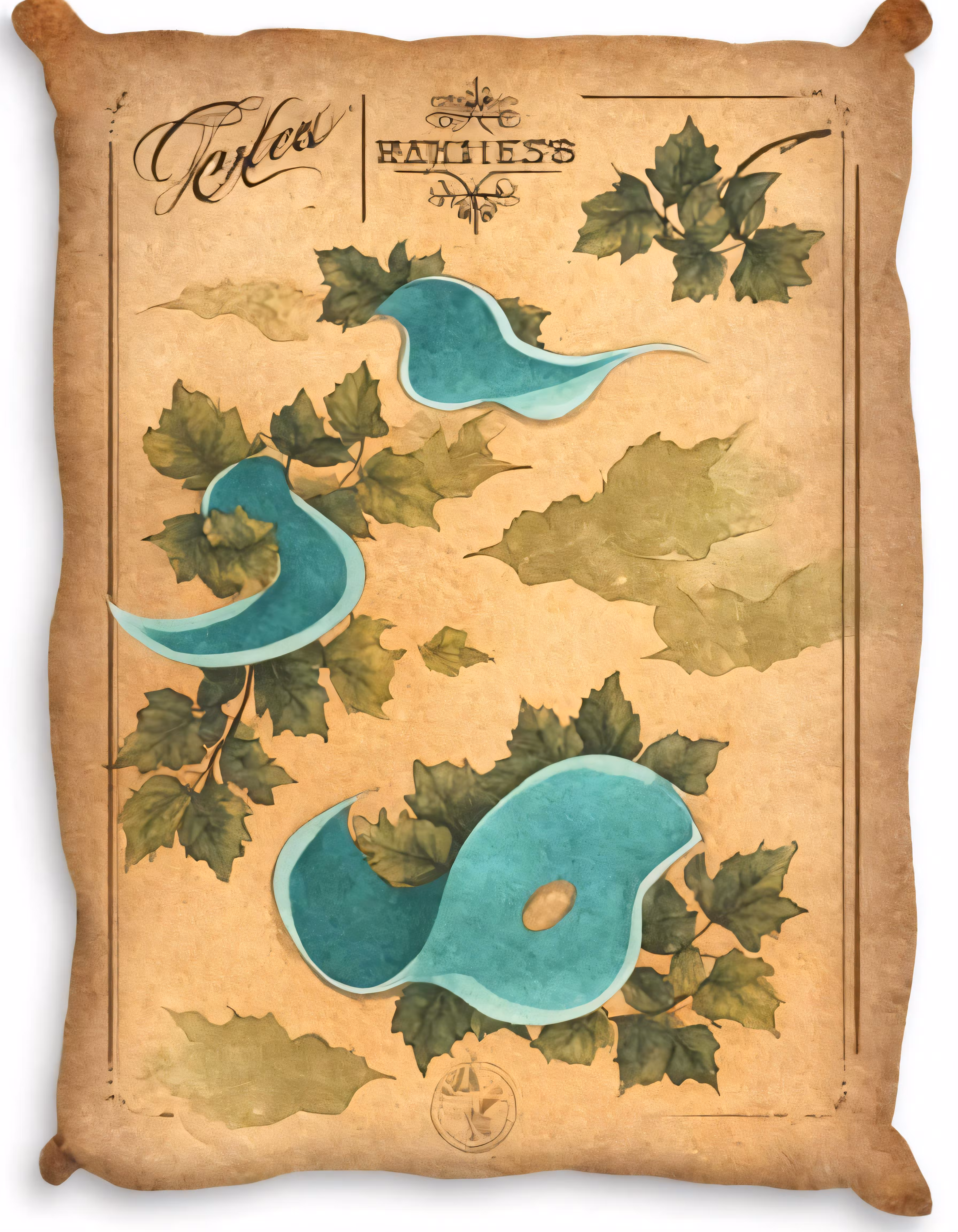High resolution picture, free to use, an artistic painting on parchment paper that looks like birds sitting on ivy leaves