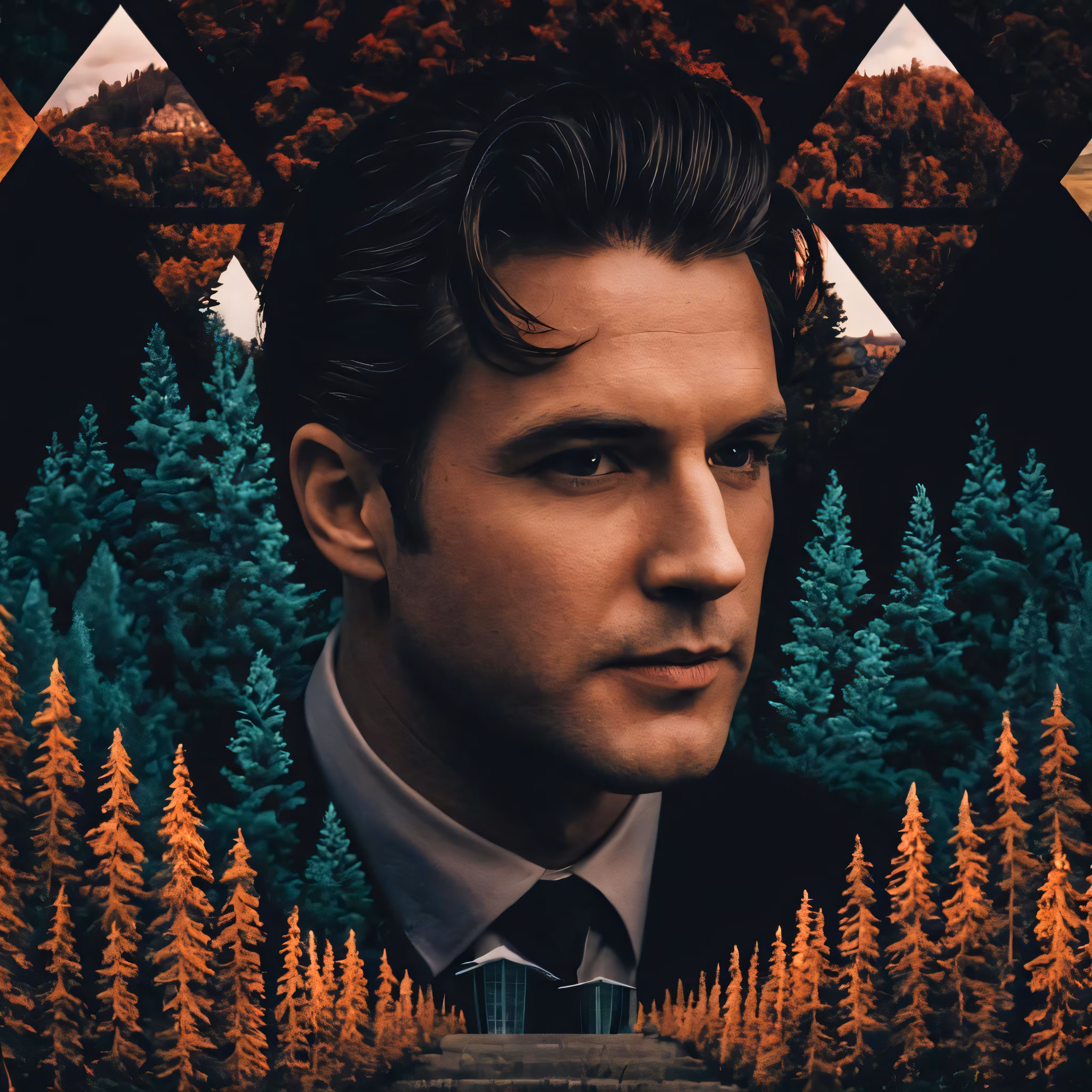 High resolution picture, free to use, an artistic painting shows a man standing in front of mountains with pine trees