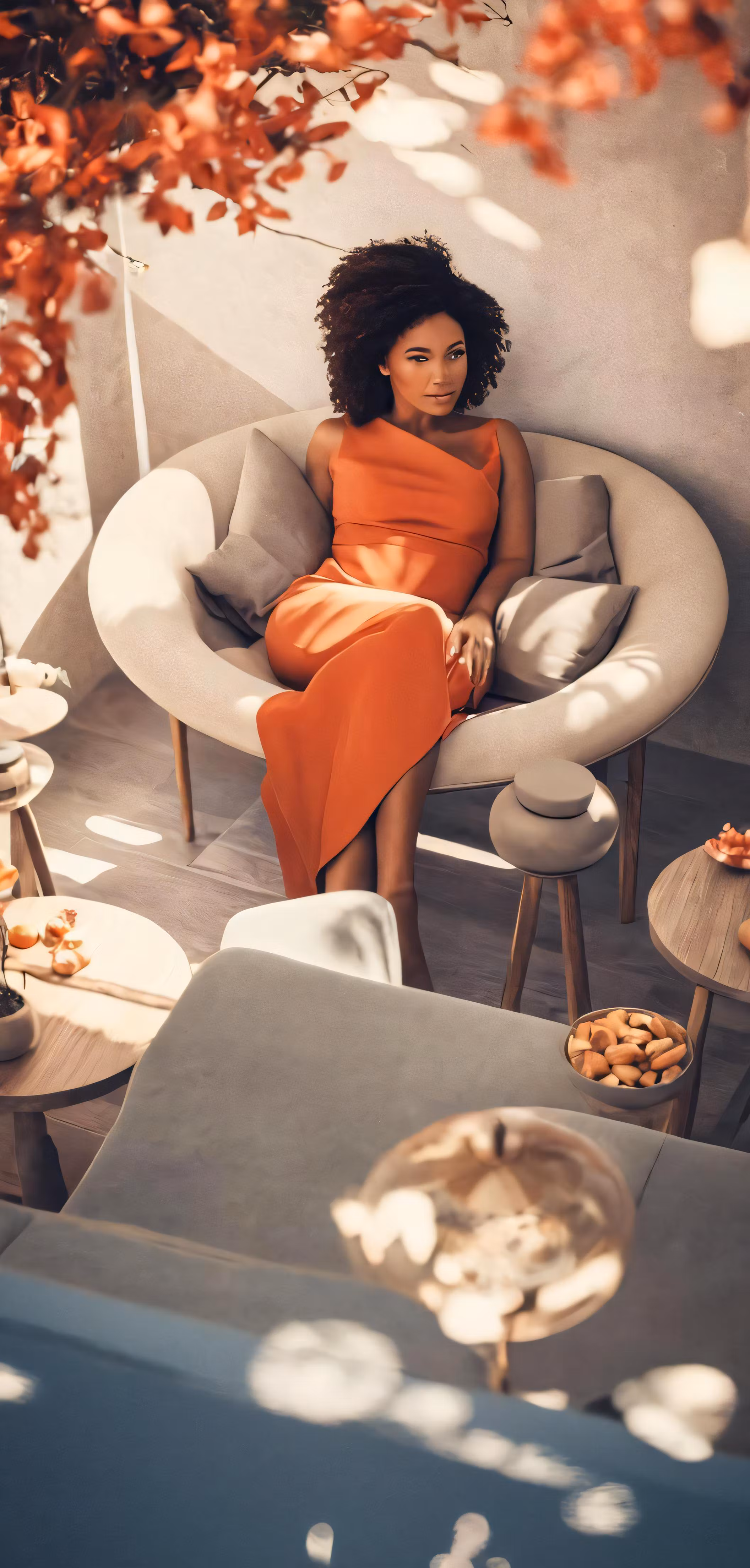 High resolution picture, free to use, an artistic photo shows a woman in an orange dress
