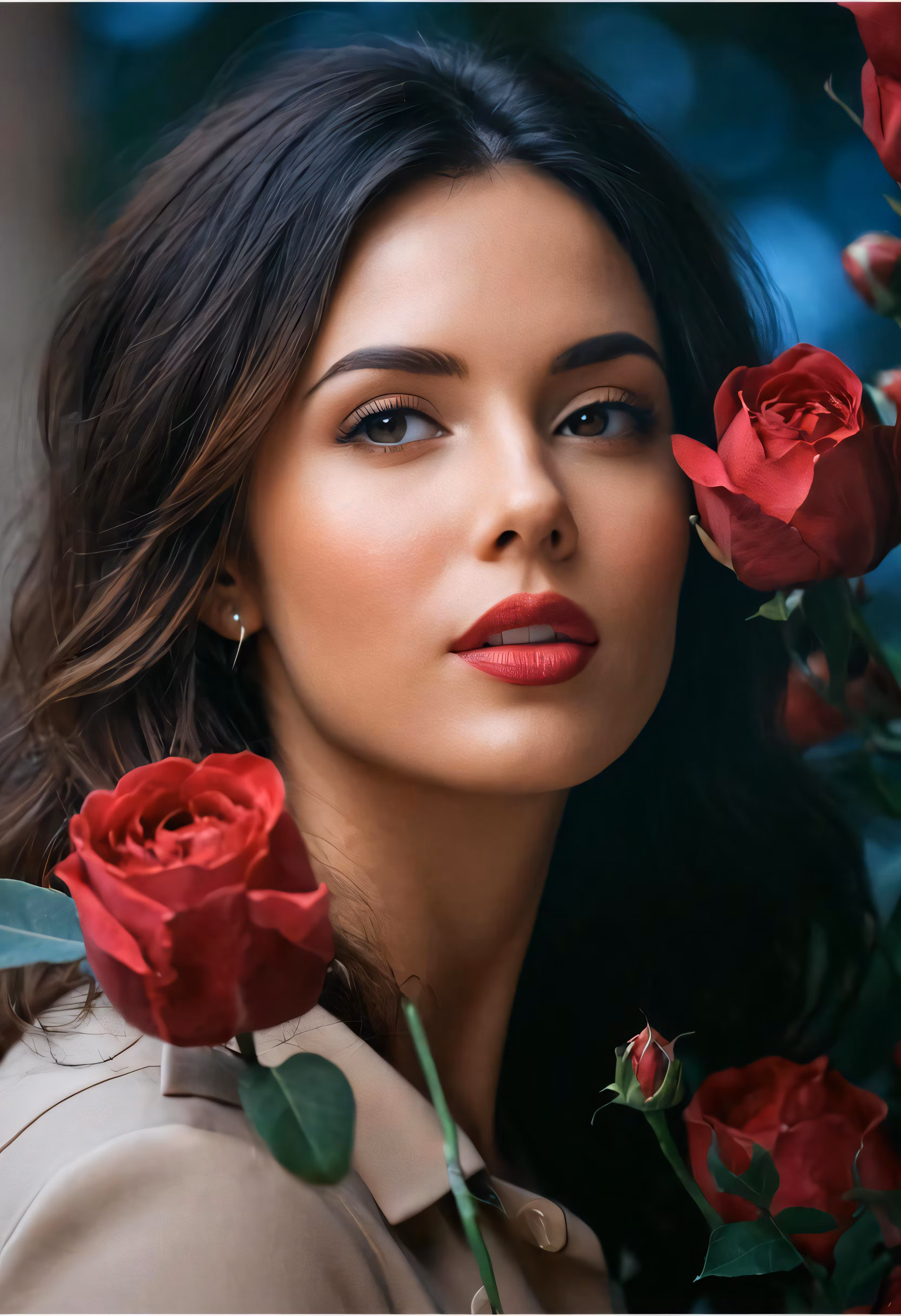 High resolution picture, free to use, an artistic photograph of a woman with roses around her neck