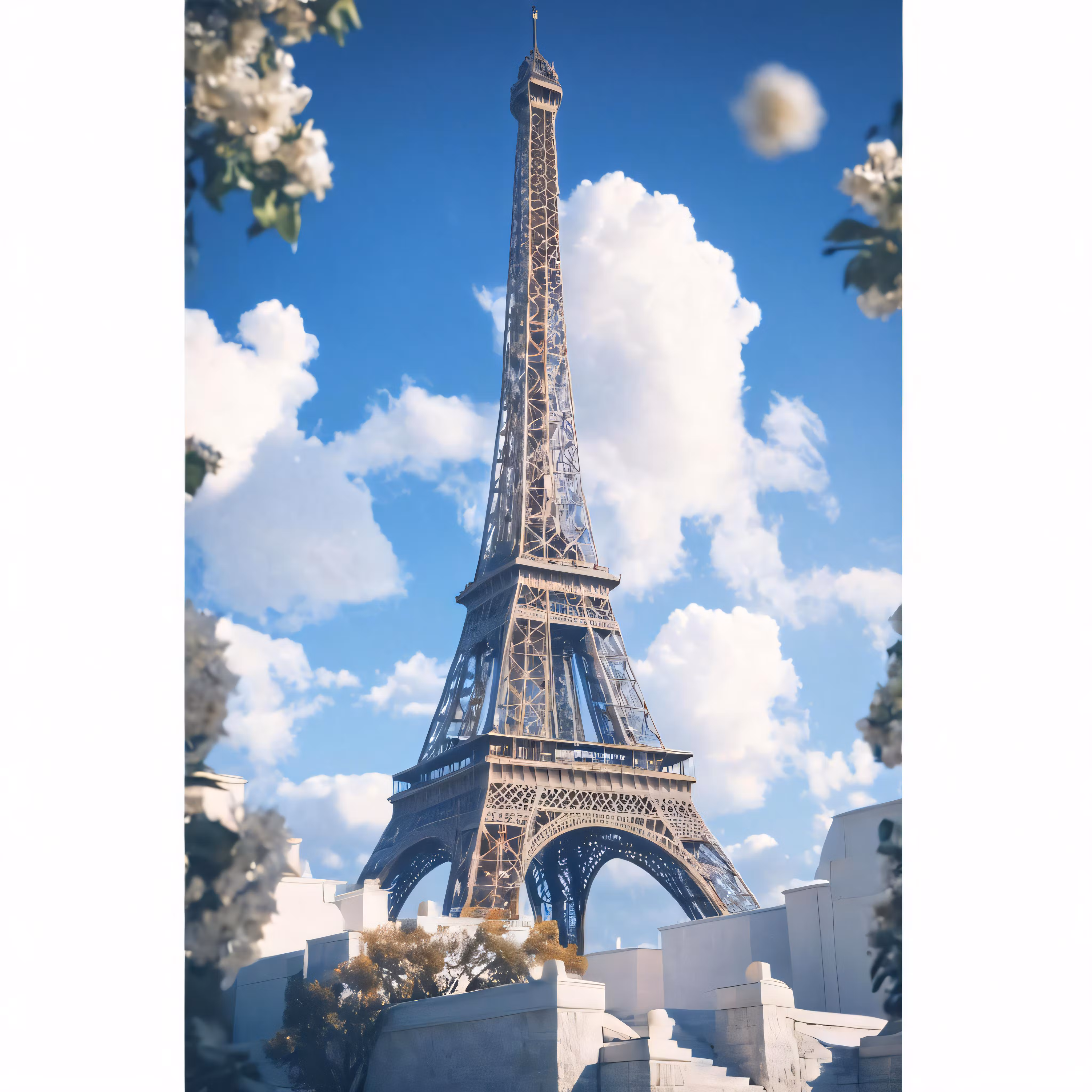 High resolution picture, free to use, an artistic picture of the eiffel tower with blue sky in the background