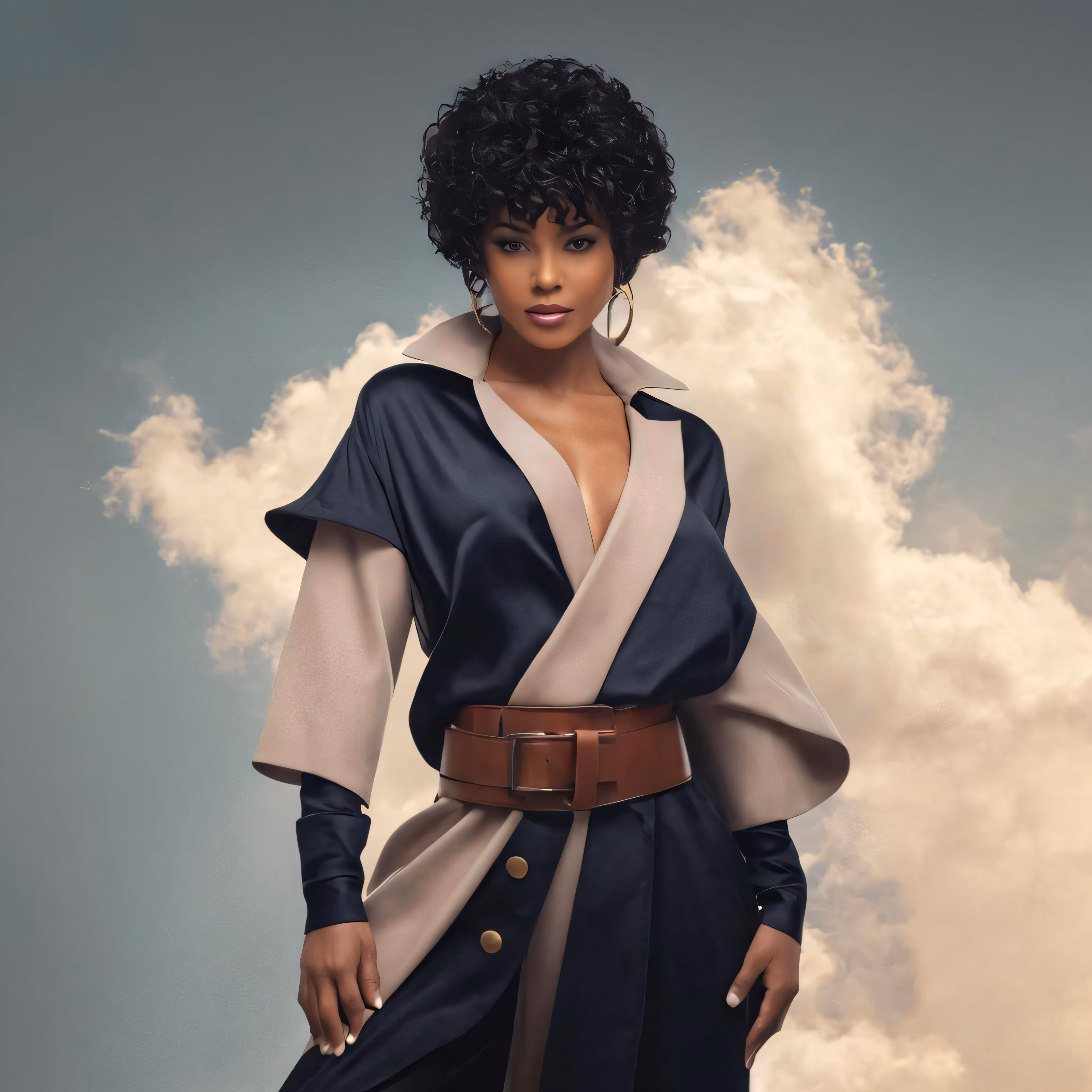 High resolution picture, free to use, an artistic rendering of a woman standing in front of clouds