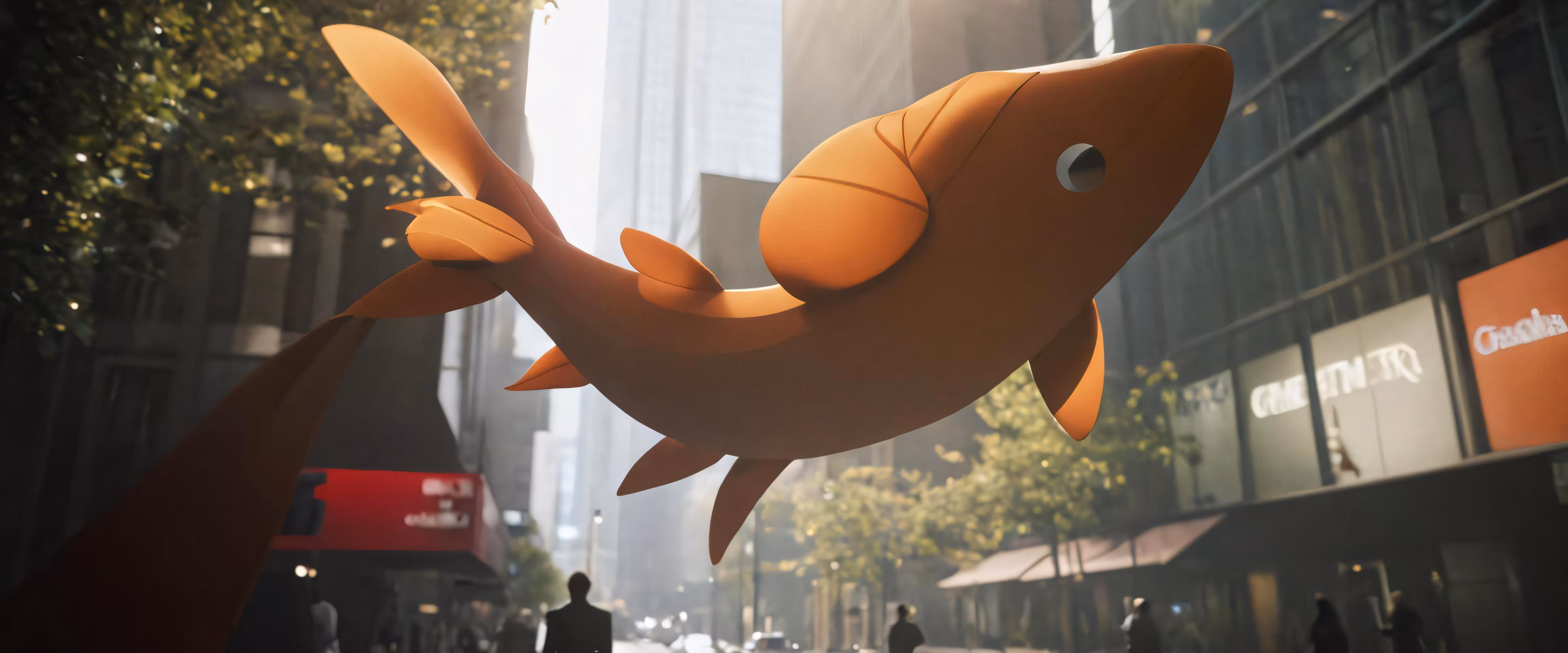 High resolution picture, free to use, an artistic rendering of the face of a giant fish on a city street