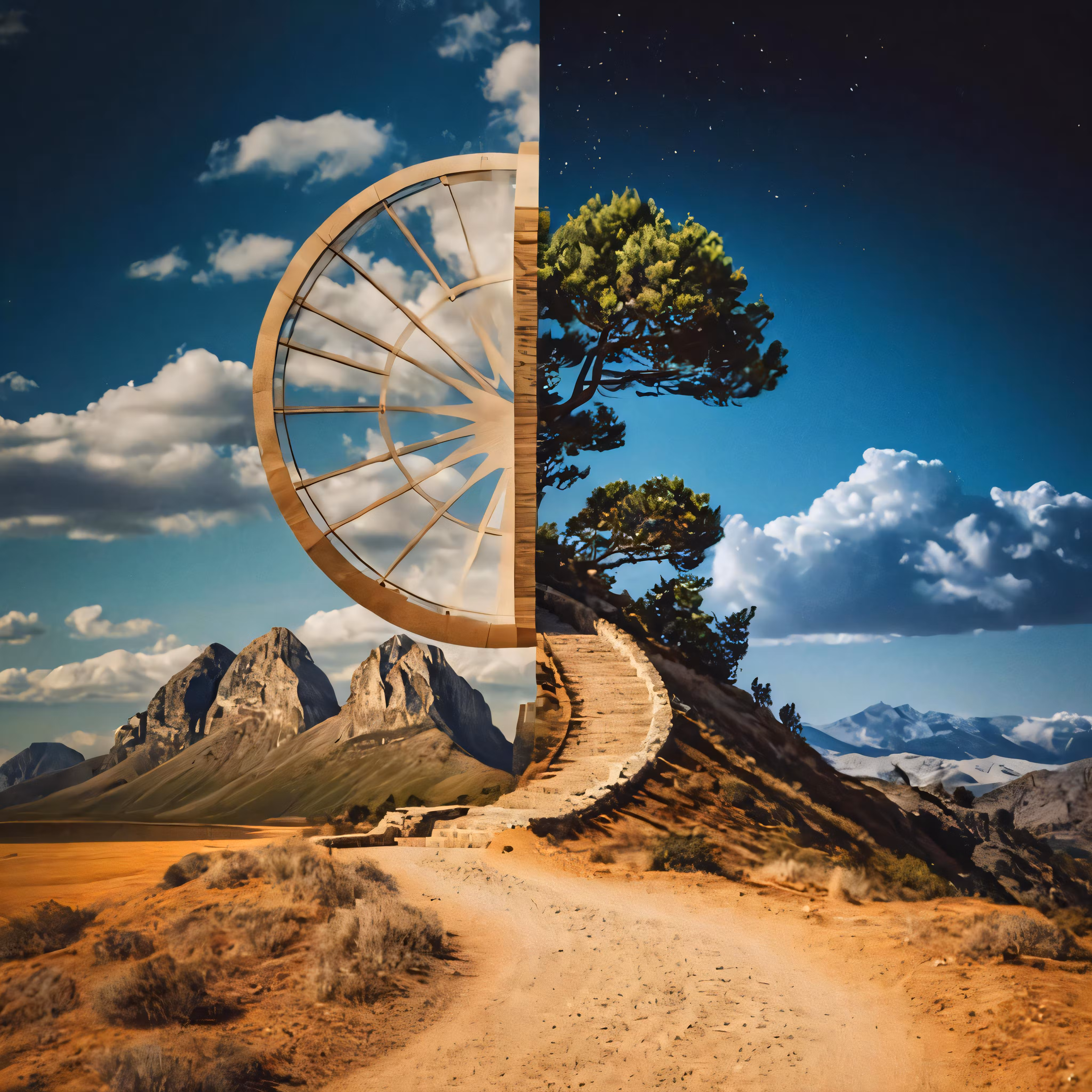 High resolution picture, free to use, an artistic view of a staircase with trees on top