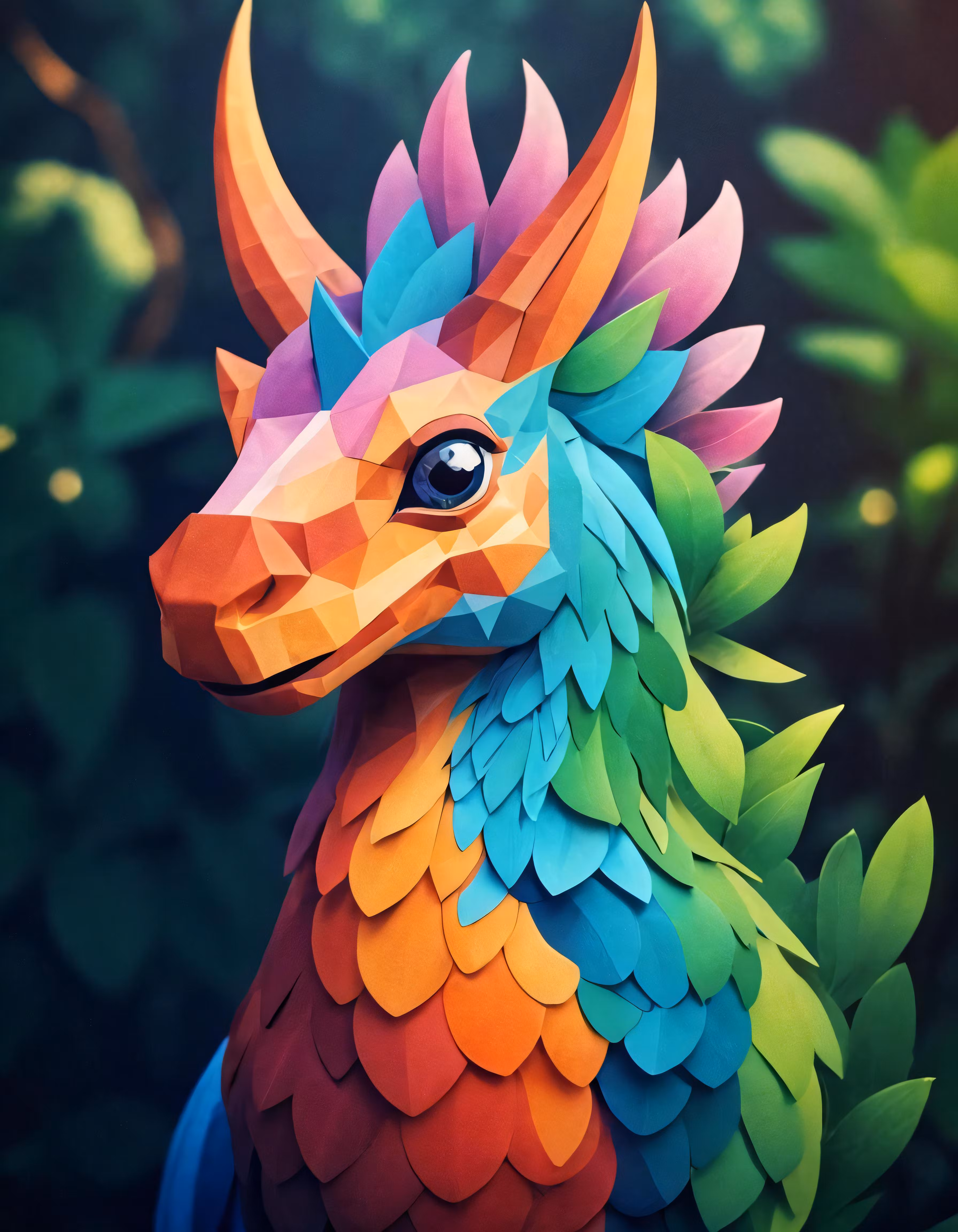 High resolution picture, free to use, an artistically designed colorful animal sitting next to plants