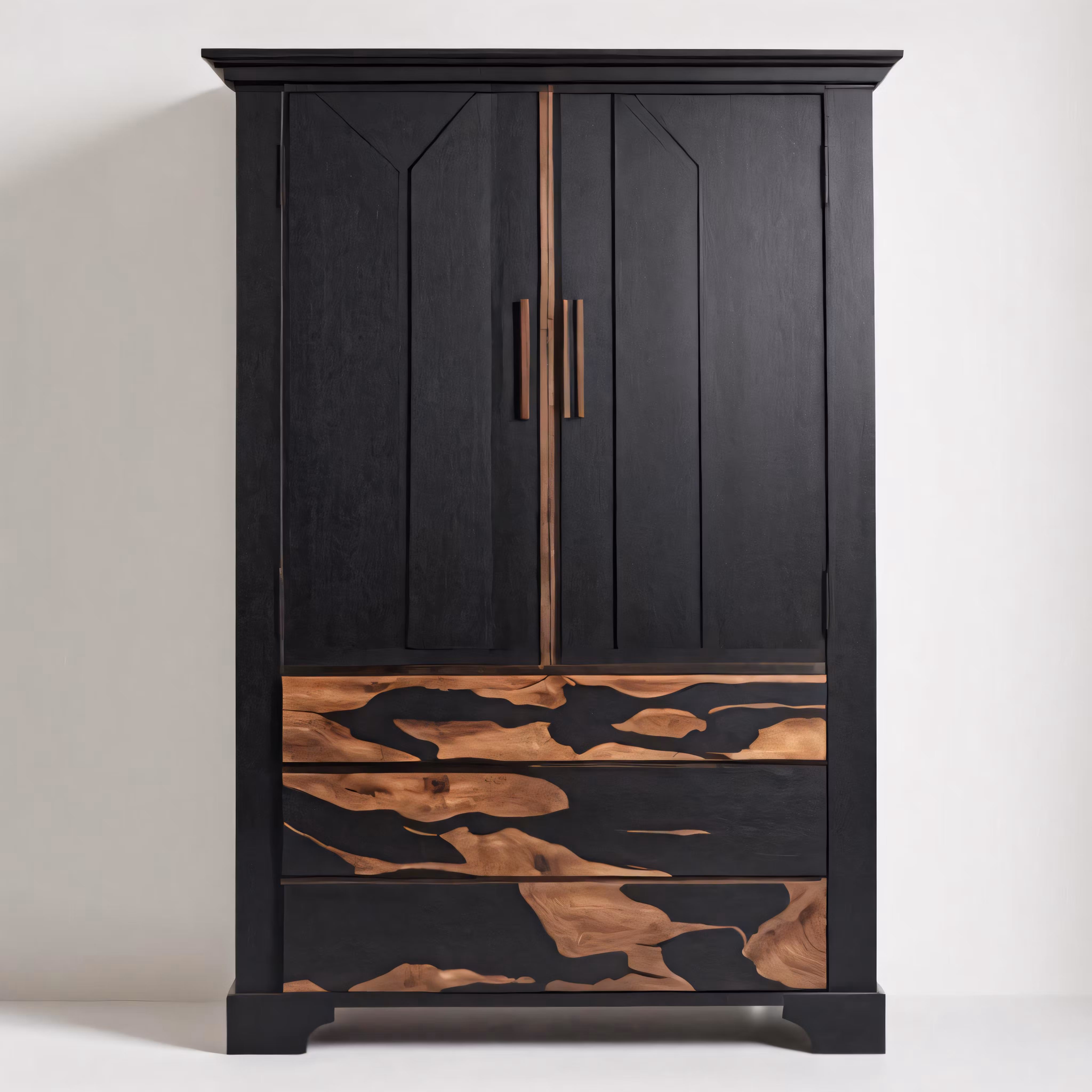 High resolution picture, free to use, an artsy black armoire with wood and metal detailing