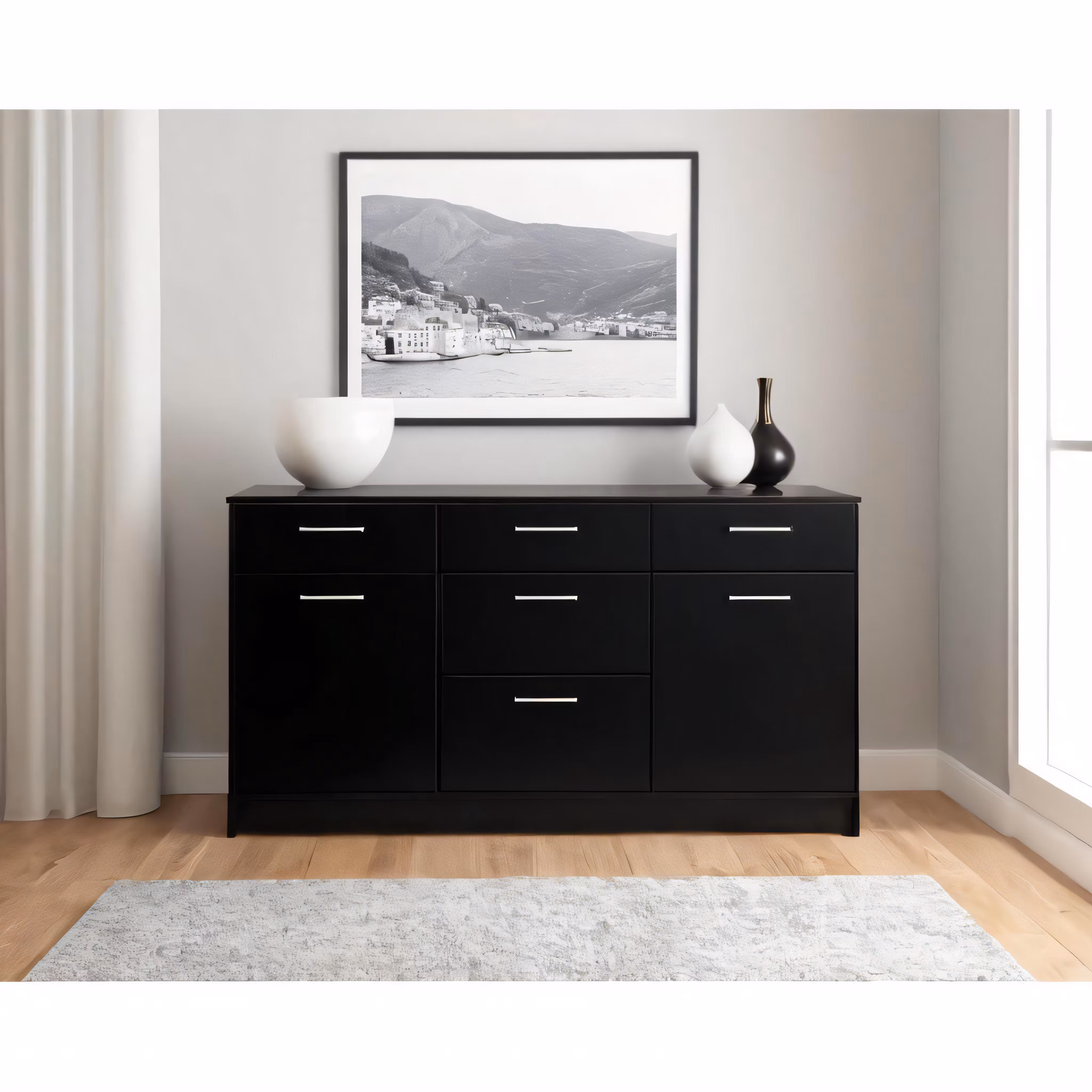 High resolution picture, free to use, an artwork hangs above a black sideboard with three white vases