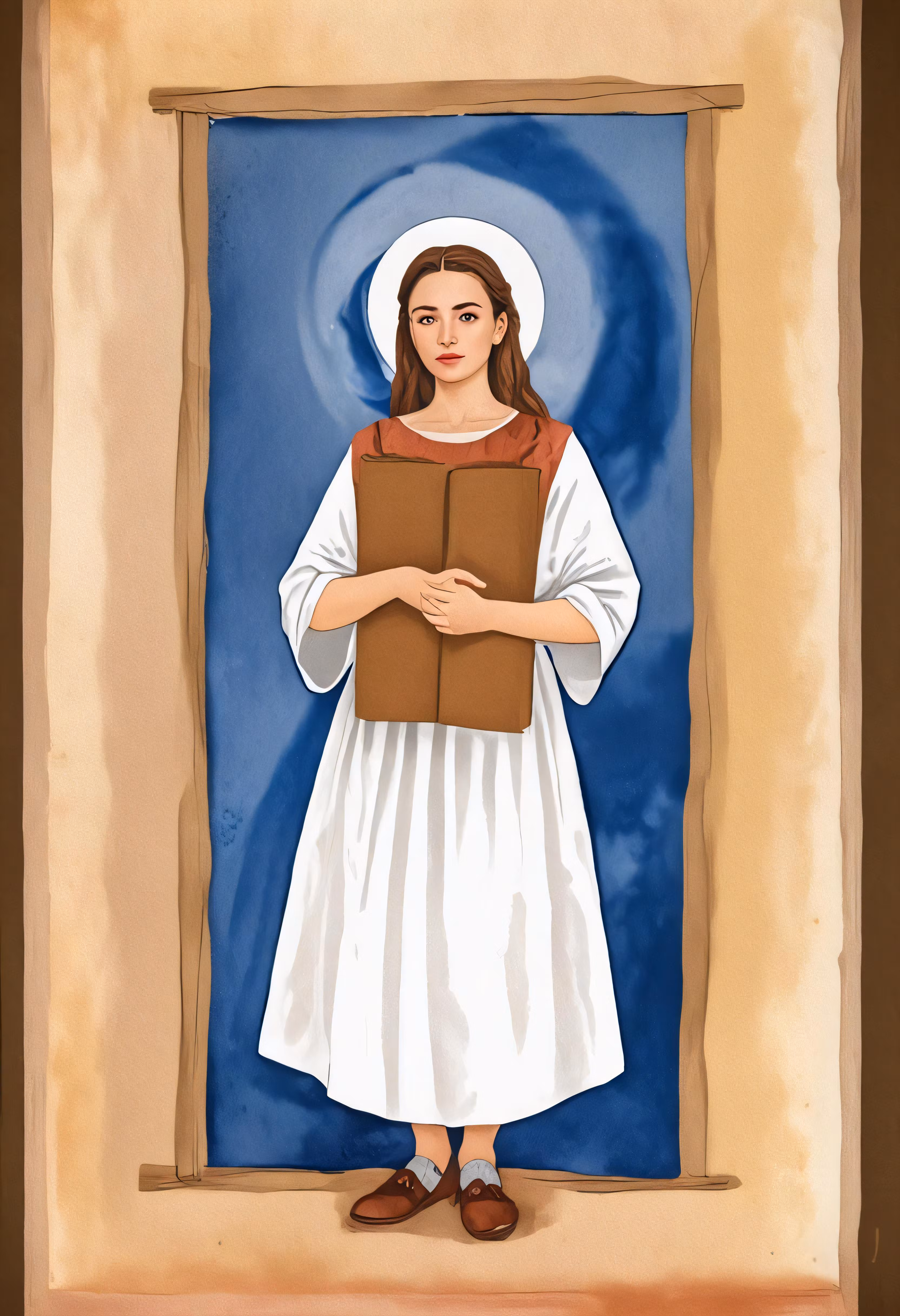 High resolution picture, free to use, an artwork of a young woman dressed in white holding a box