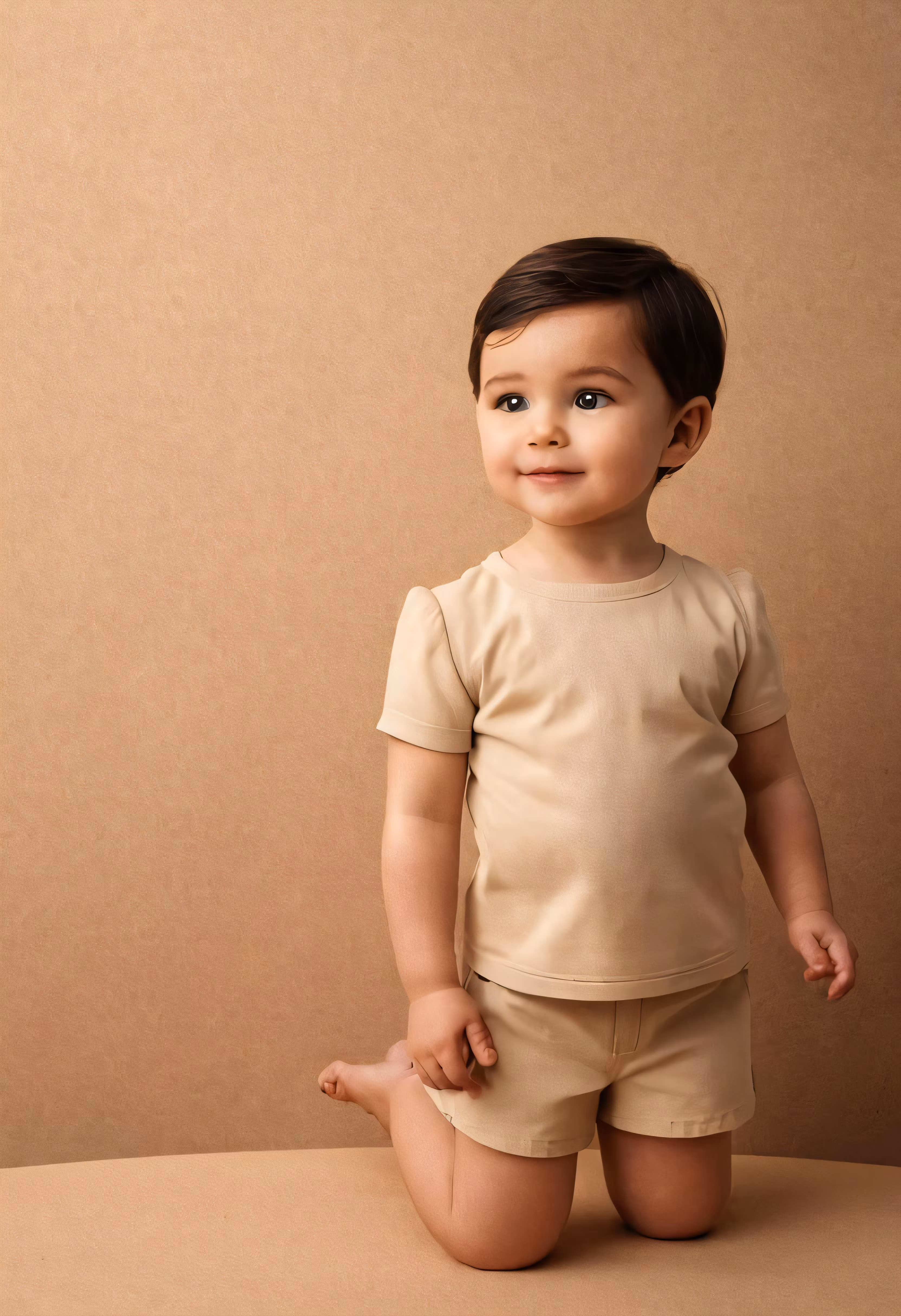 High resolution picture, free to use, an asian baby boy wearing tan shorts and a beige t shirt