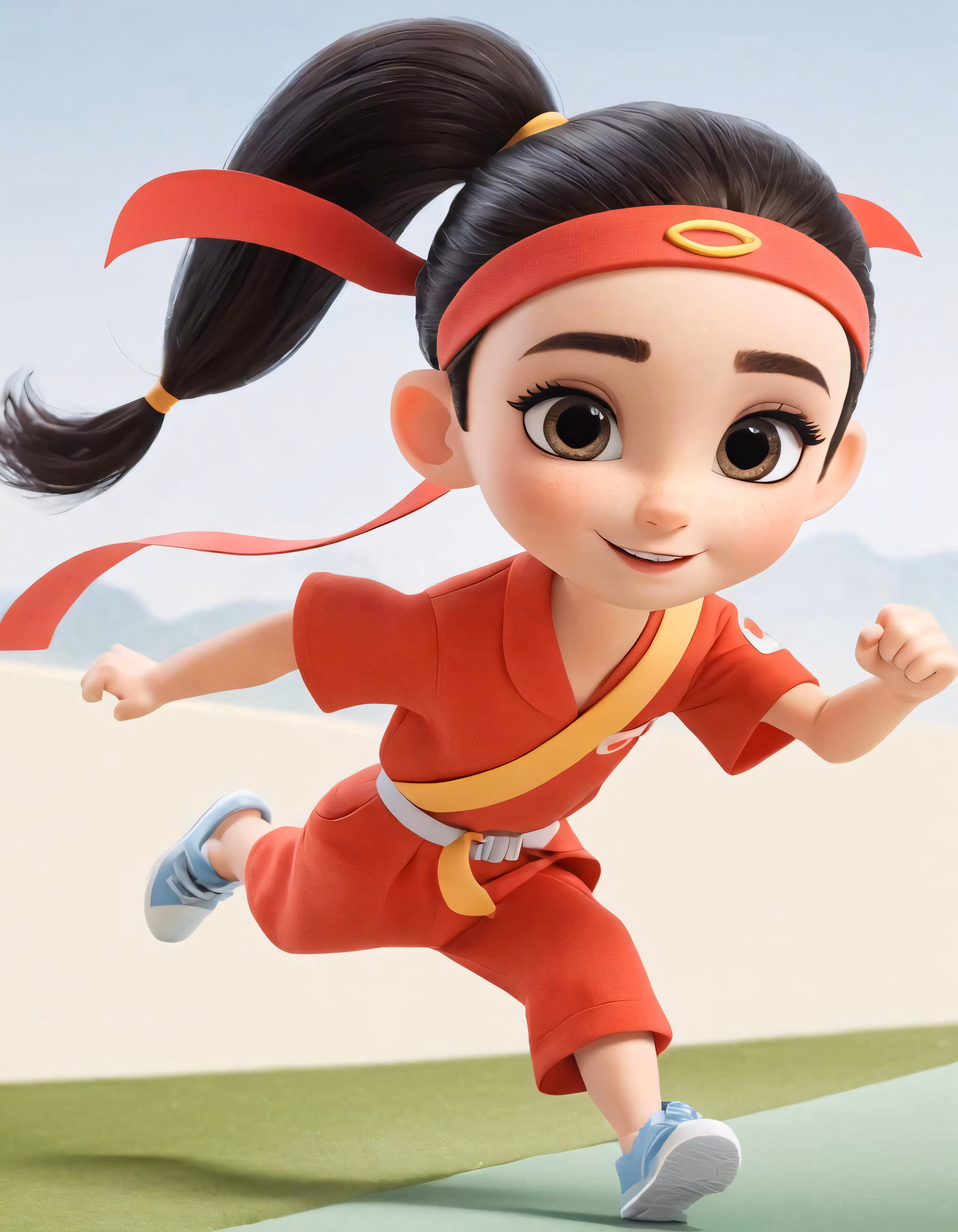 High resolution picture, free to use, an asian cartoon girl running in front of mountains