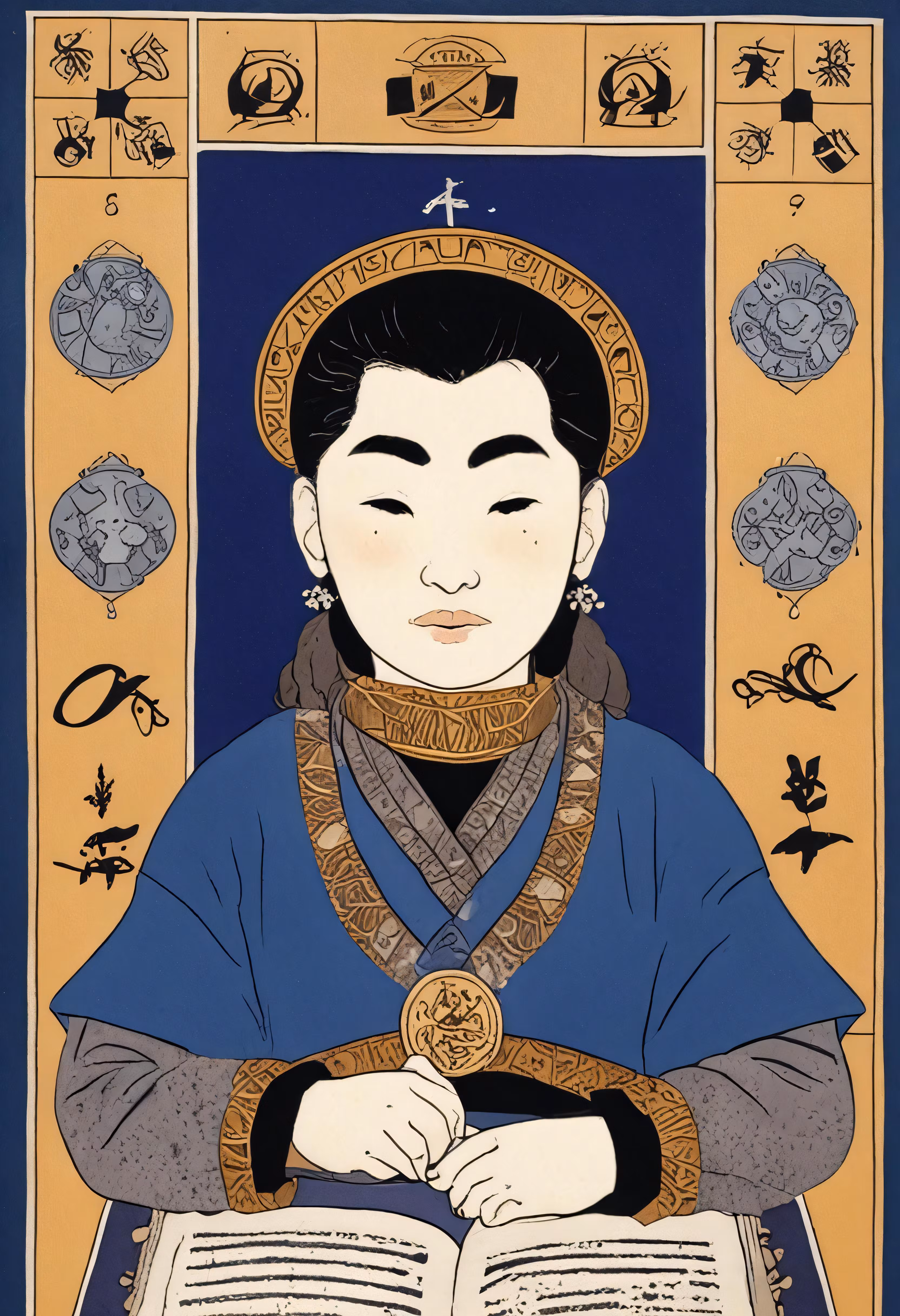 High resolution picture, free to use, an asian painting showing the priest holding a large book