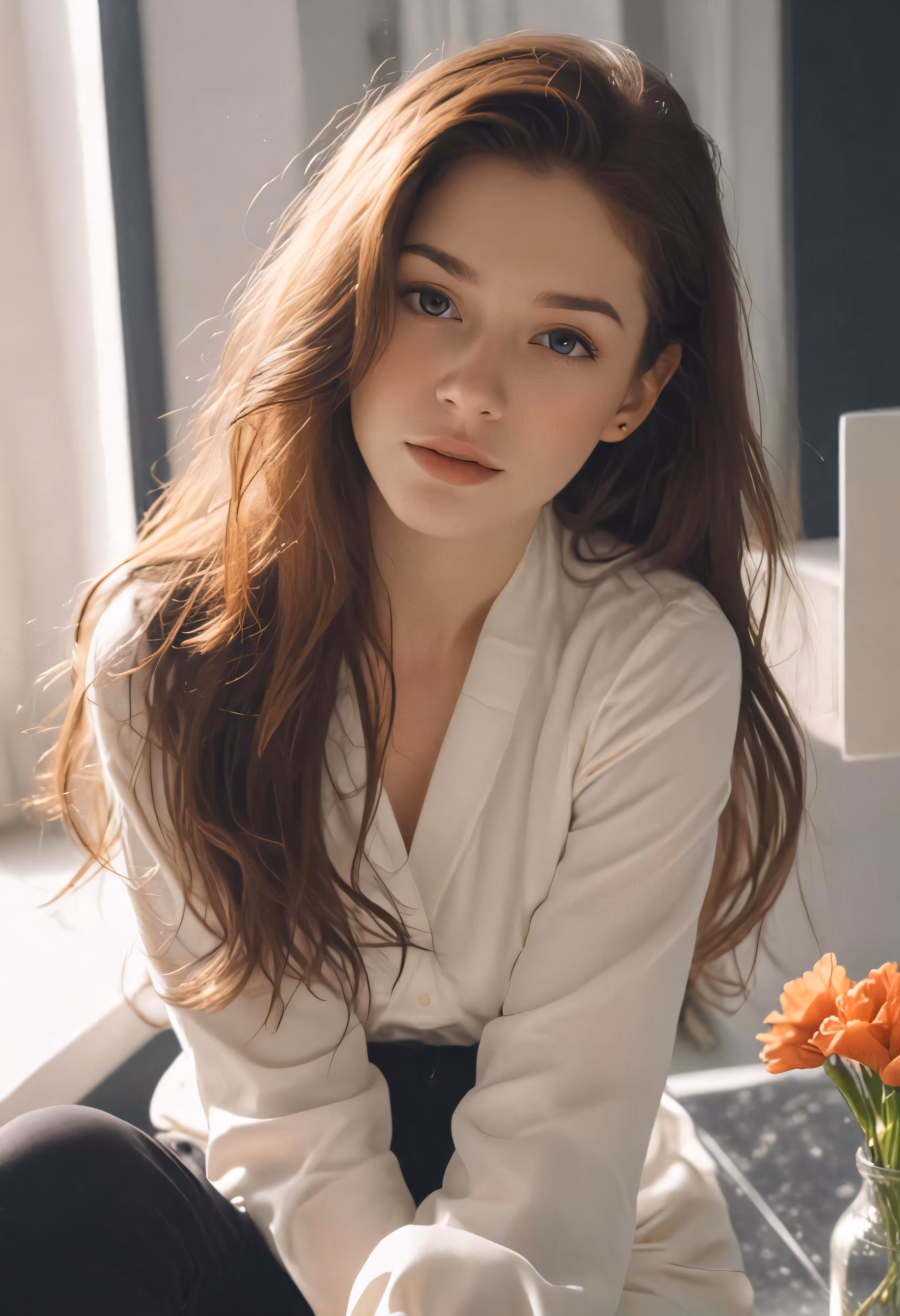 High resolution picture, free to use, an asian woman sitting on a ledge next to flowers