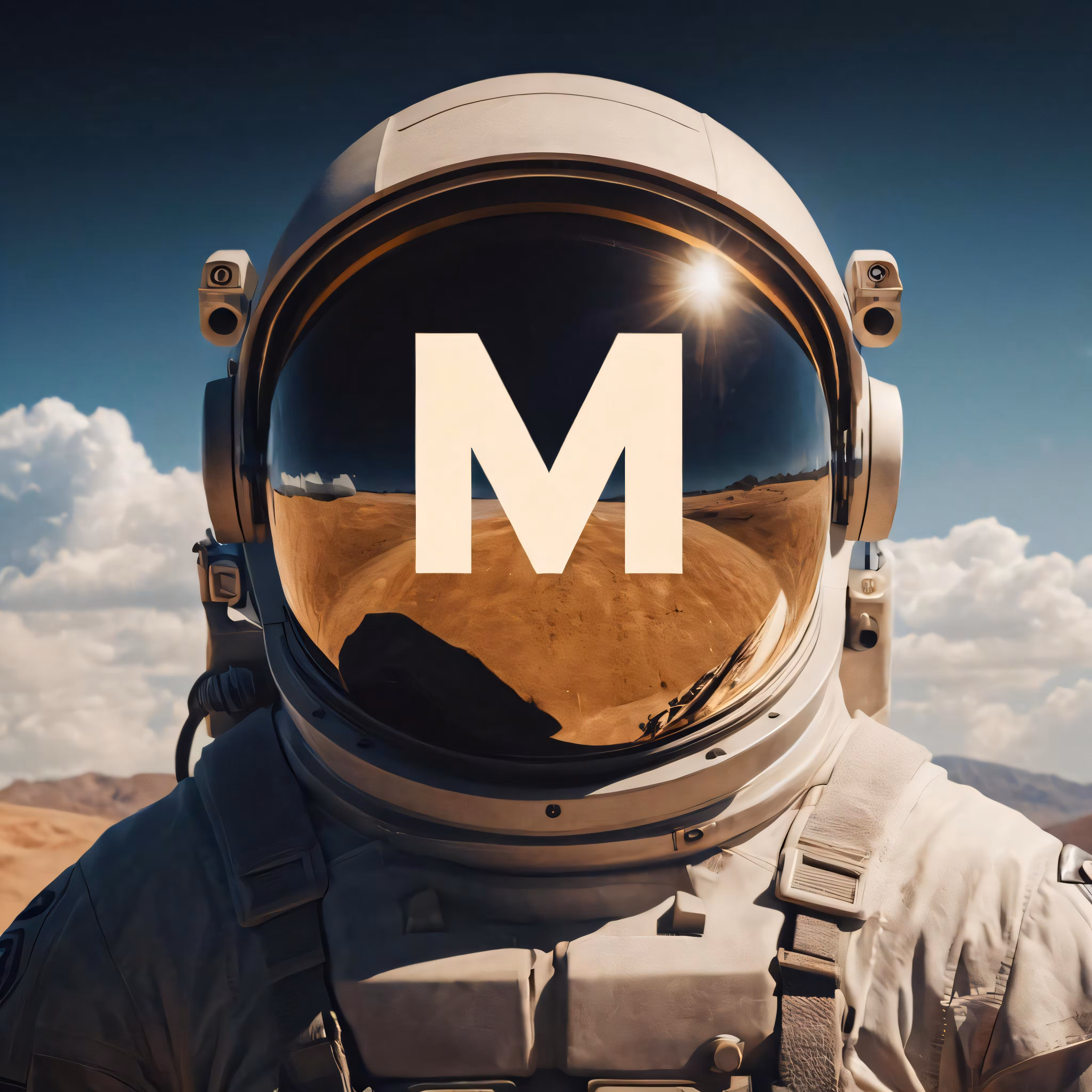 High resolution picture, free to use, an astronaut holding his head in the air, with the letter m on his face
