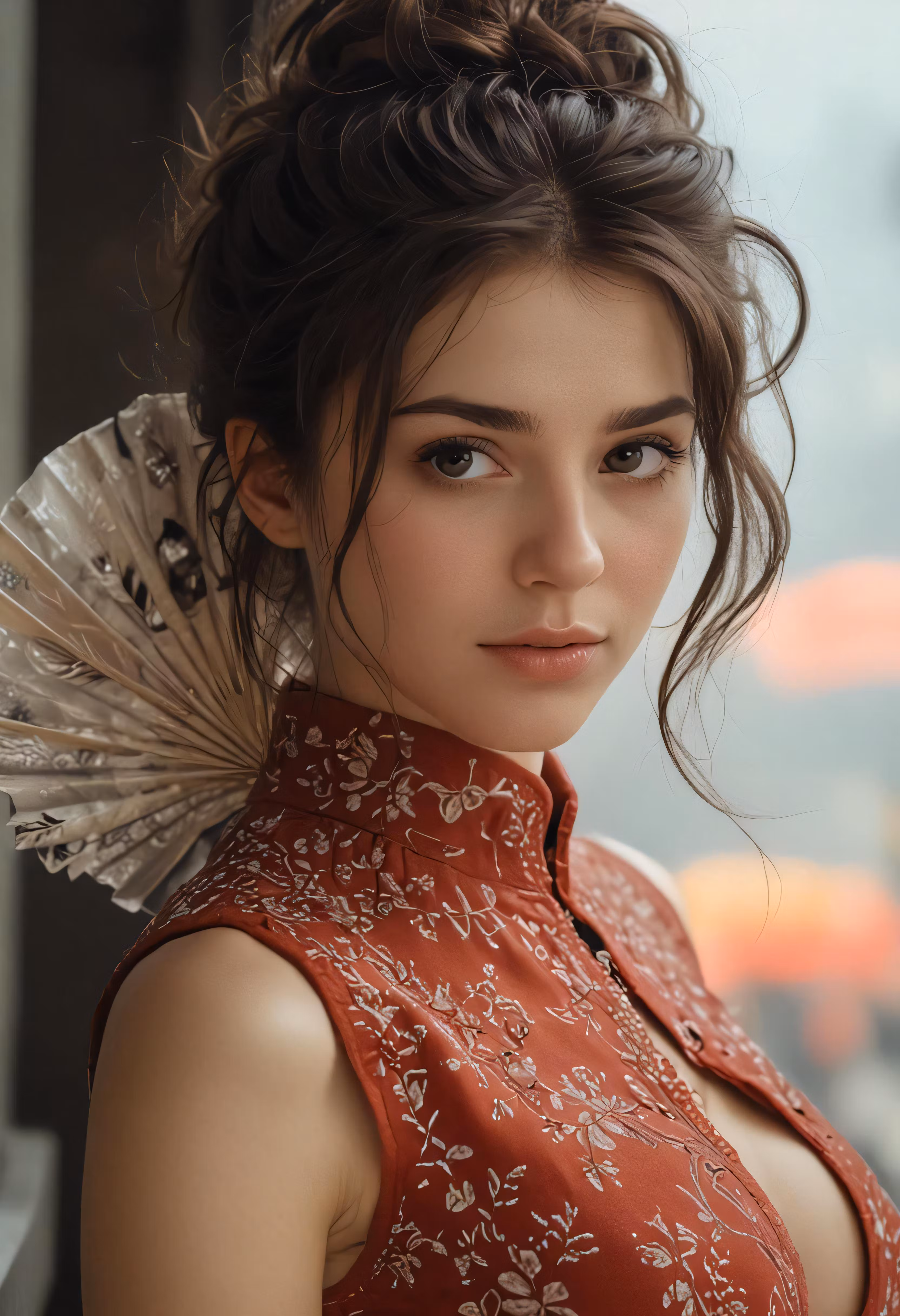 High resolution picture, free to use, an attractive woman poses for a picture, holding a fan
