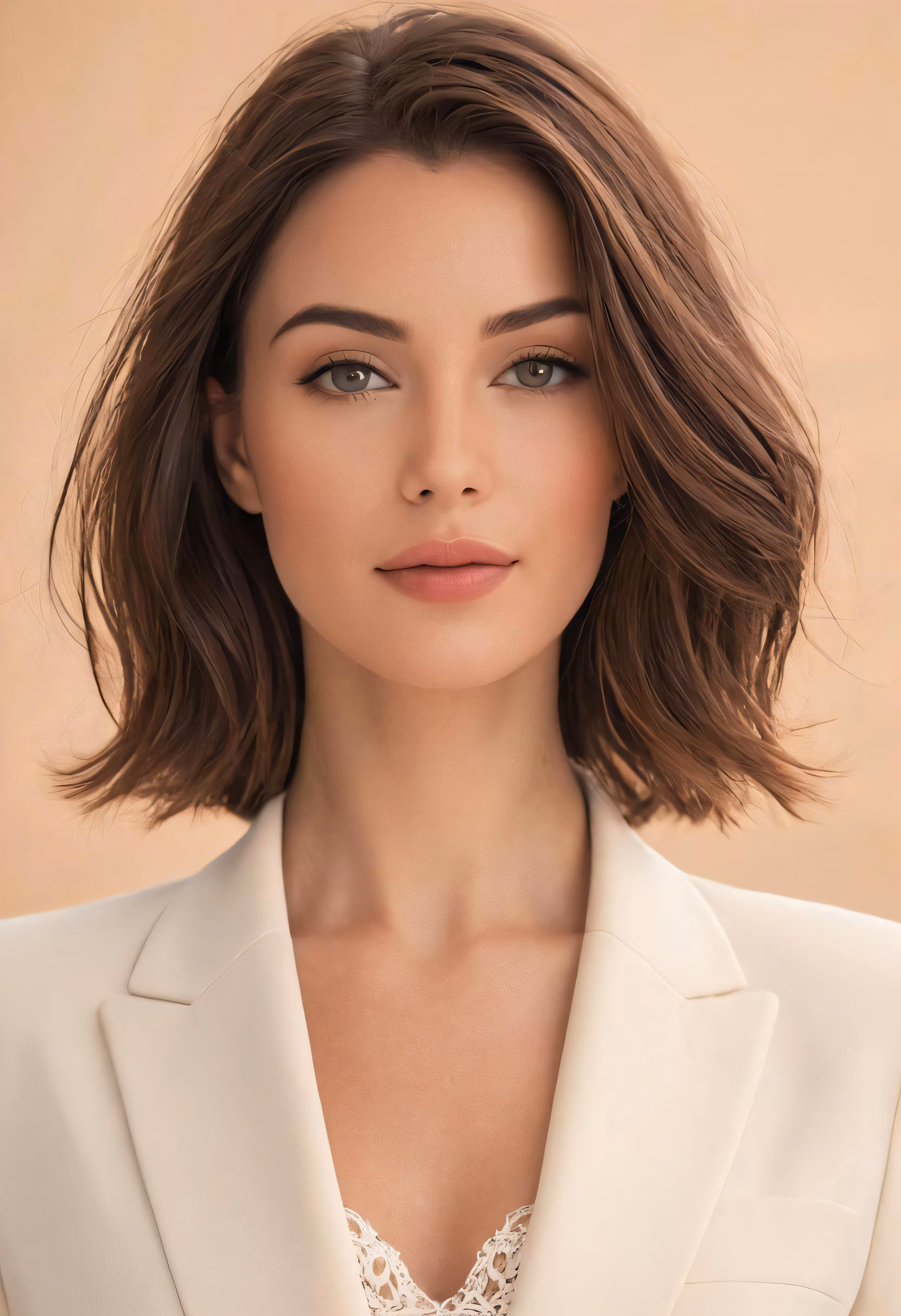 High resolution picture, free to use, an attractive woman wearing a white suit with a beaded collar