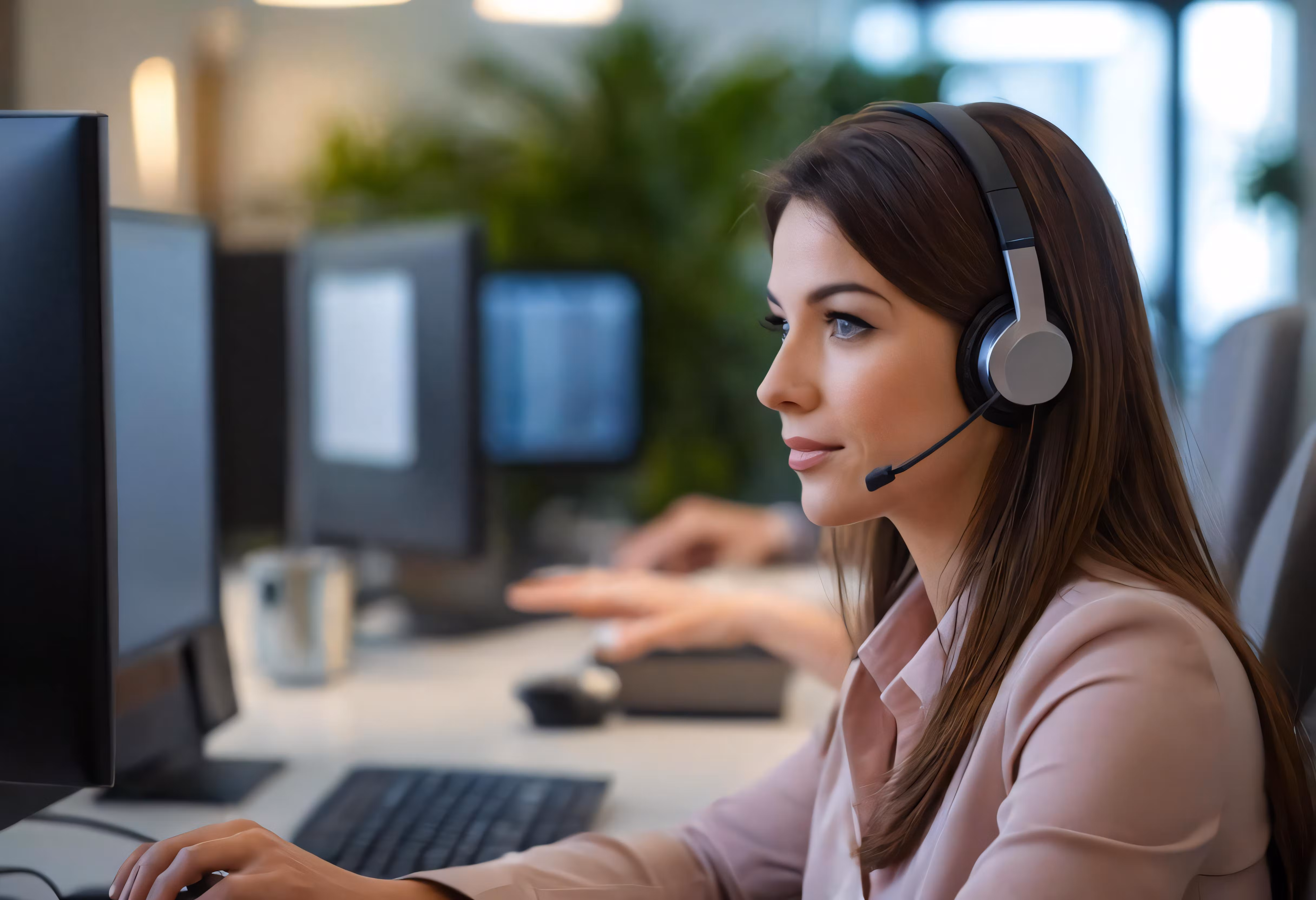 High resolution picture, free to use, an attractive woman wearing headphones working on her computer