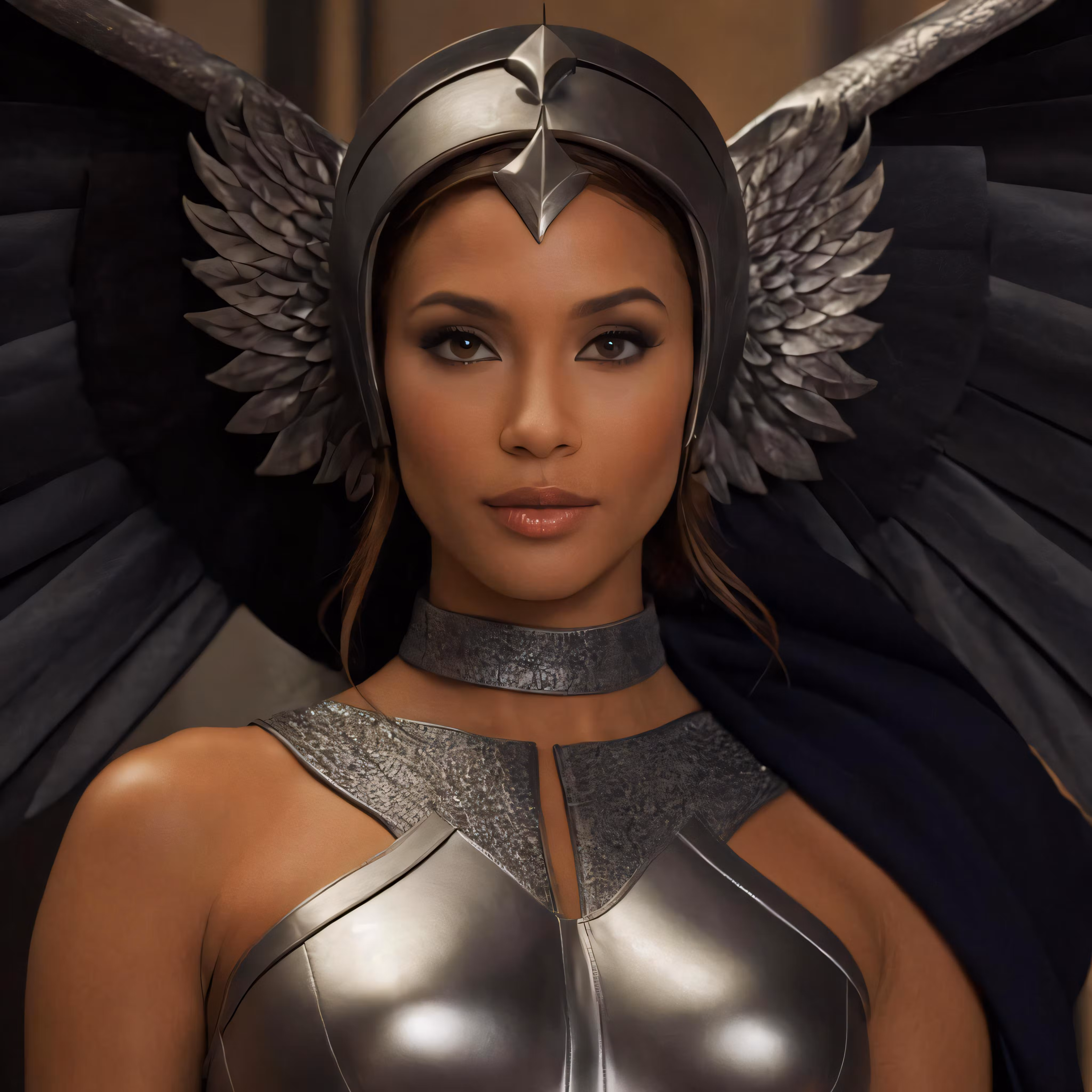 High resolution picture, free to use, an attractive woman wearing silver with large wings