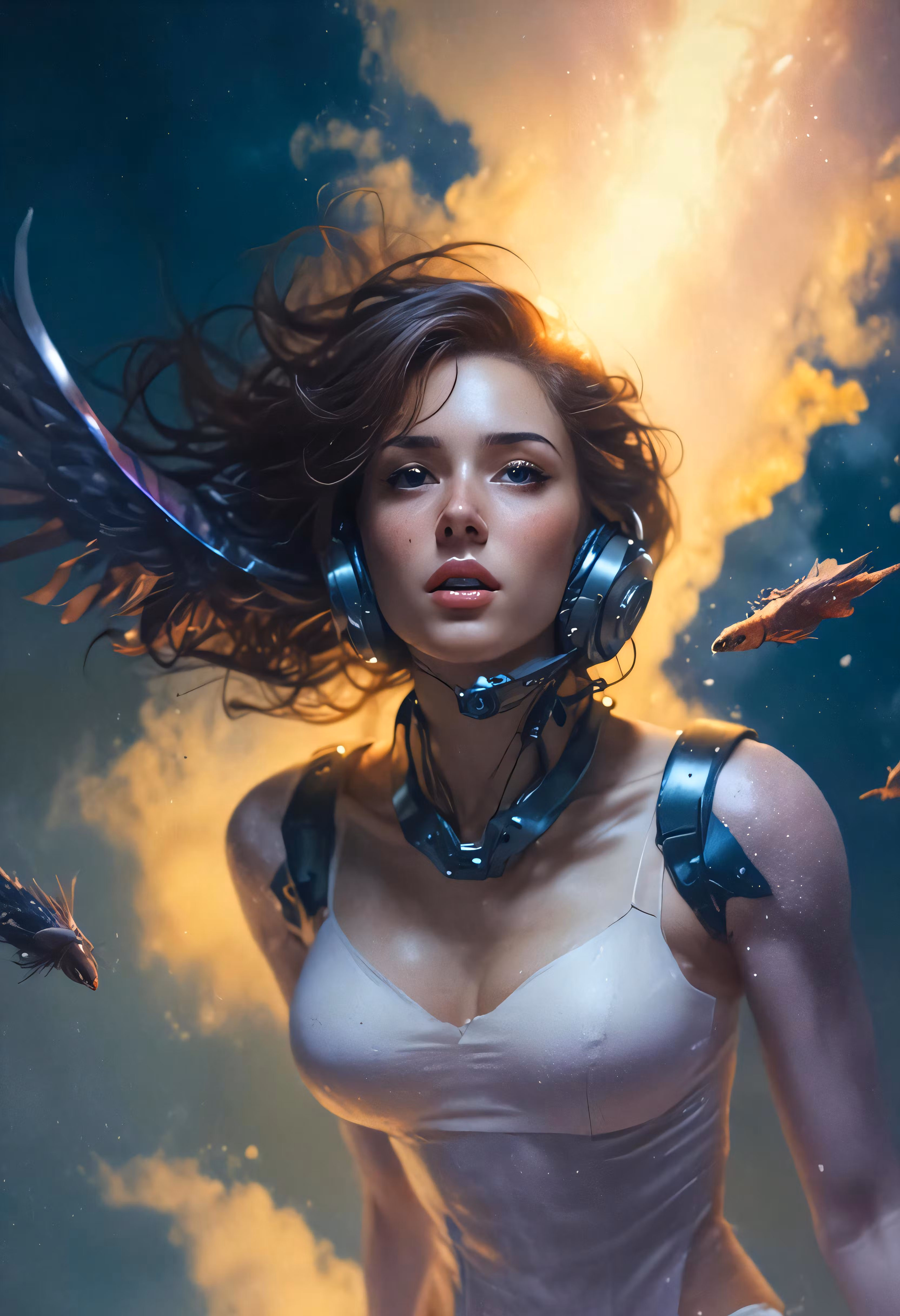 High resolution picture, free to use, an attractive woman with wings and headphones is shown