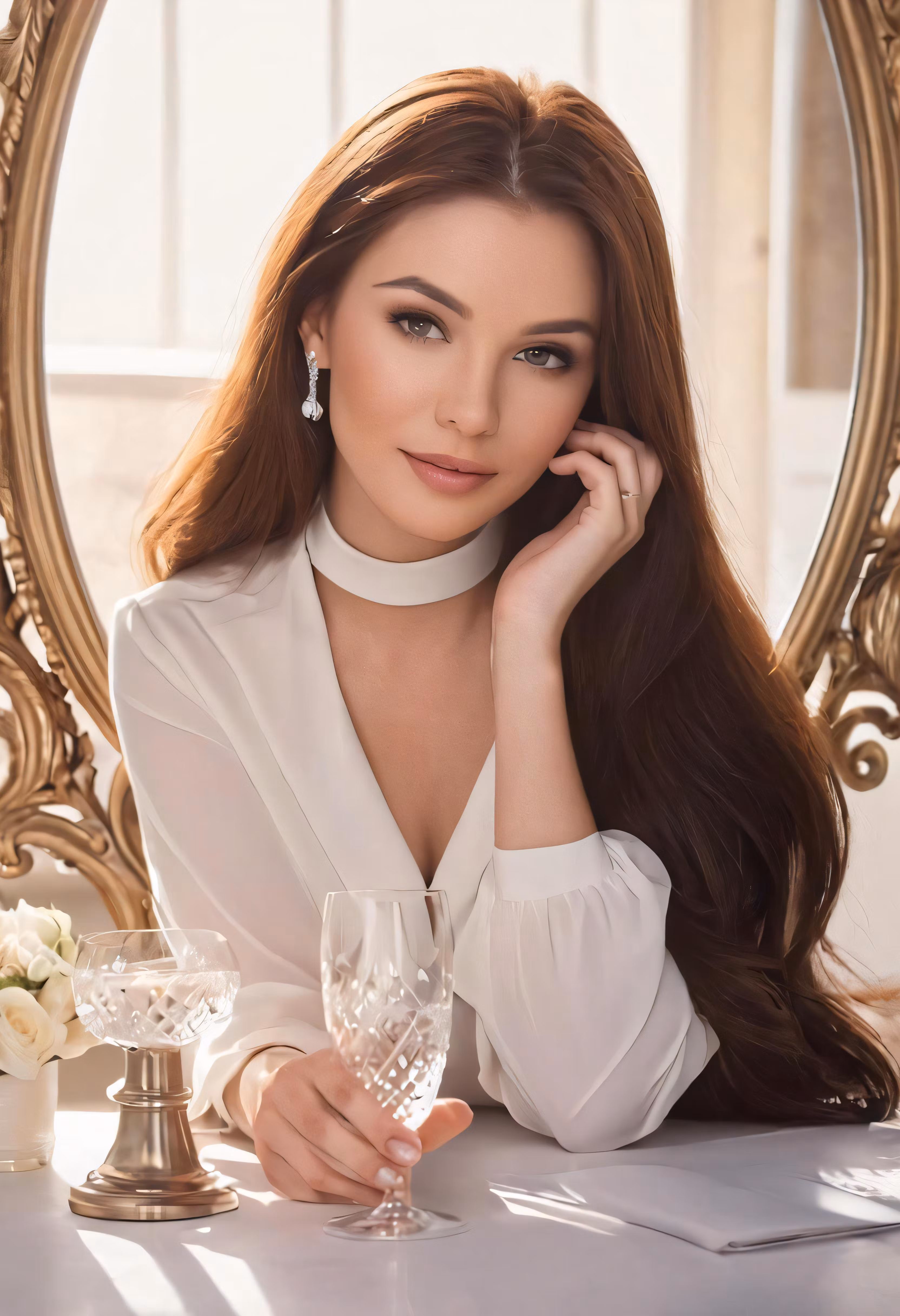 High resolution picture, free to use, an attractive young lady with long brown hair sitting in front of a gold frame