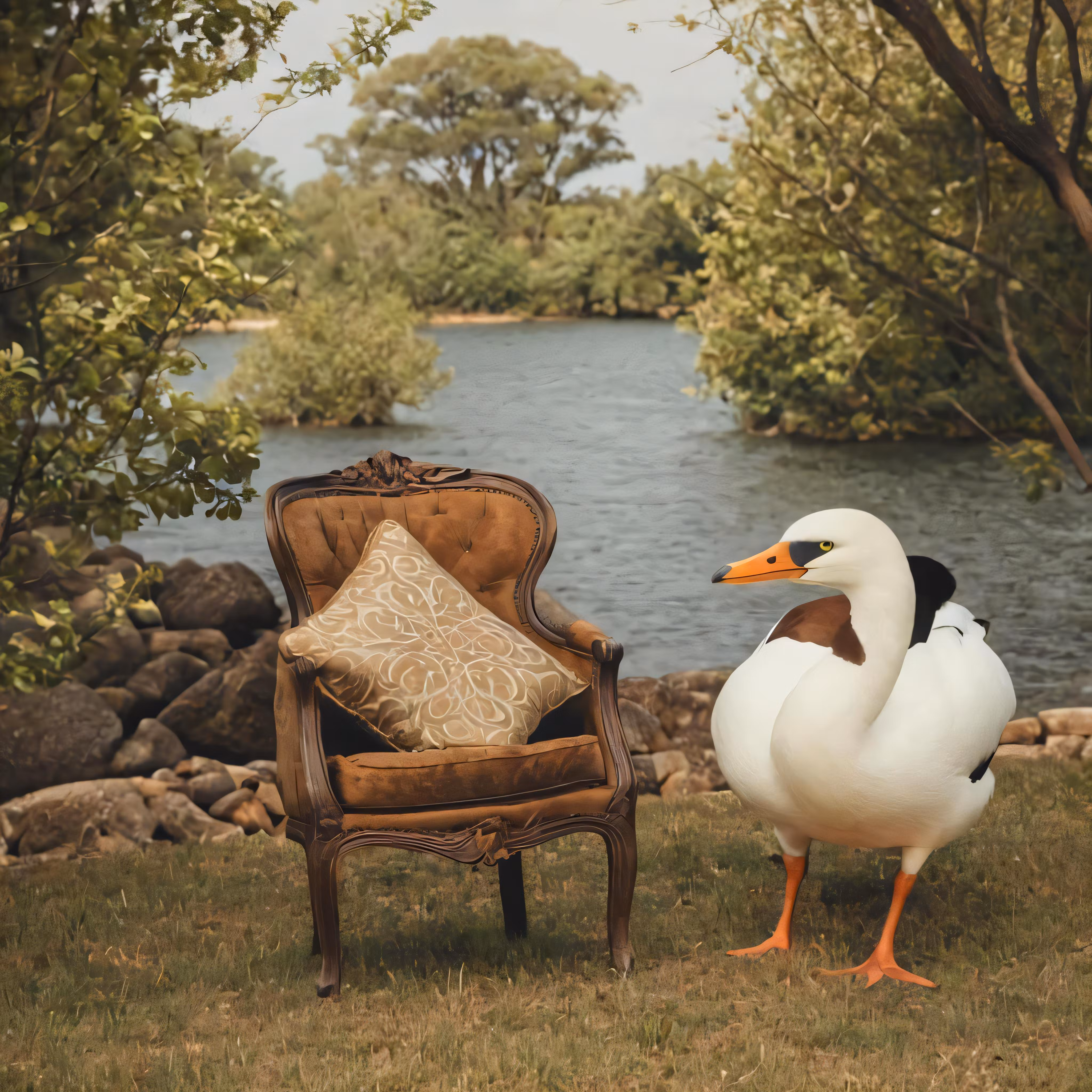 High resolution picture, free to use, an ducks standing near two chairs sitting on the grass