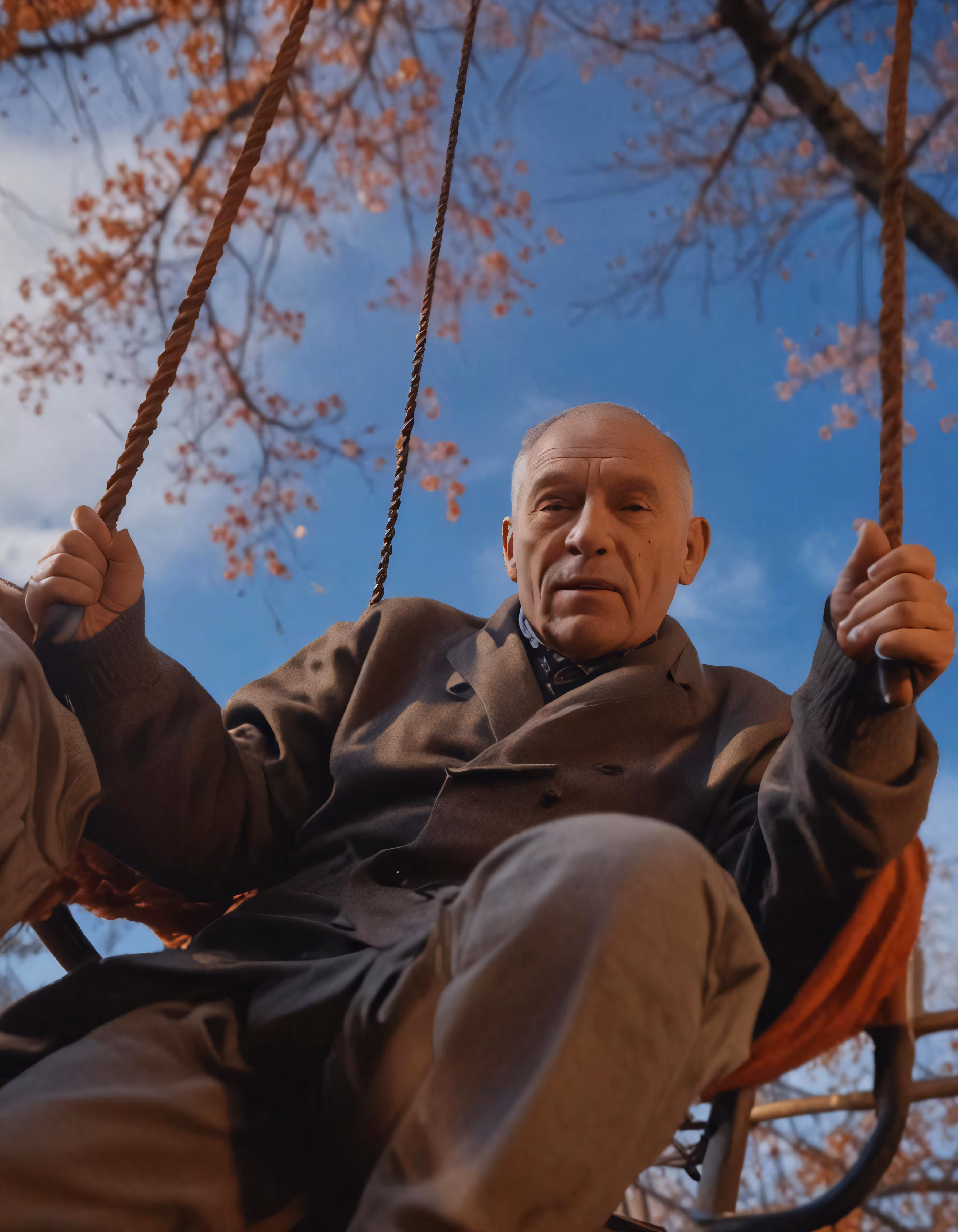 High resolution picture, free to use, an elderly man swinging on a tree swing
