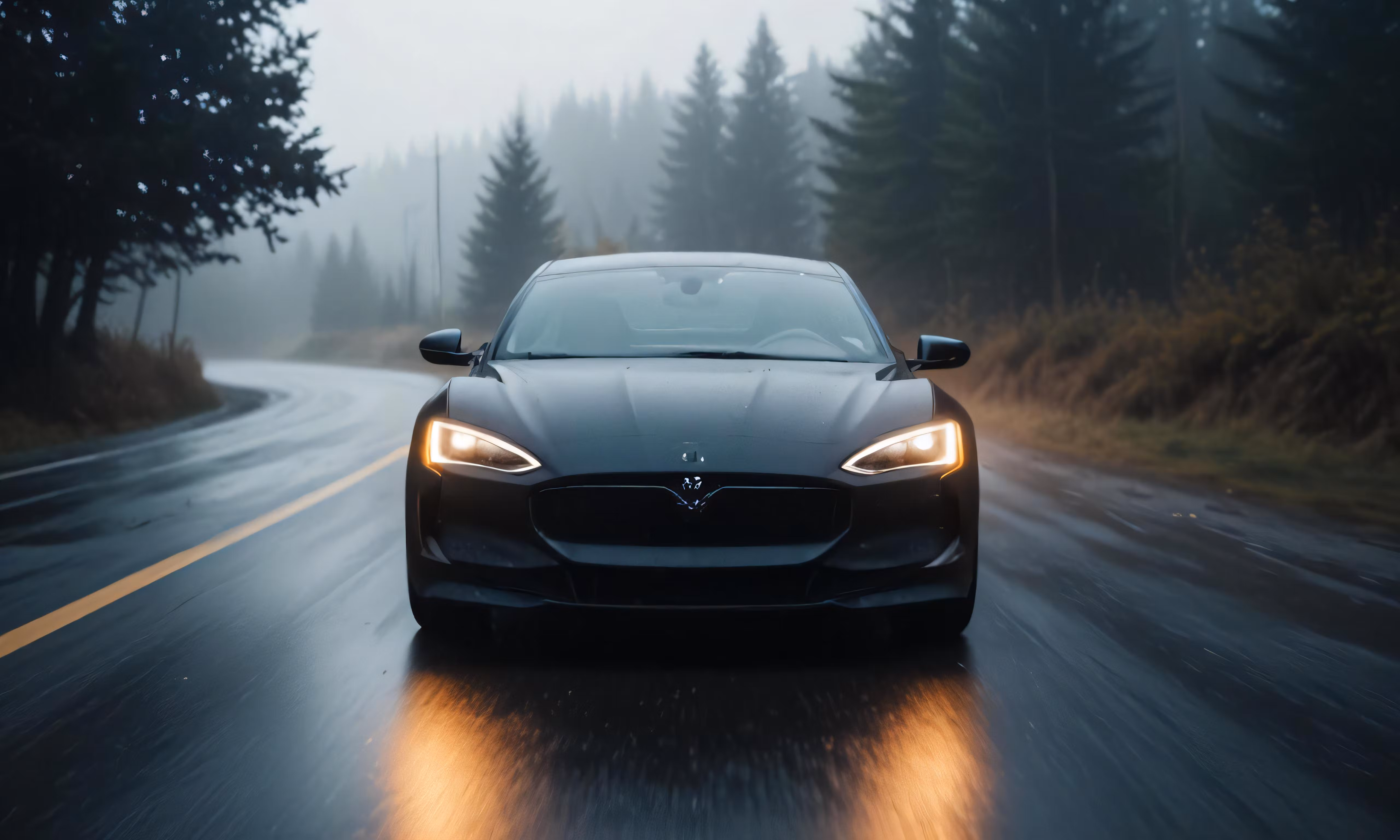 High resolution picture, free to use, an electric car is seen in the rain and on a wet road