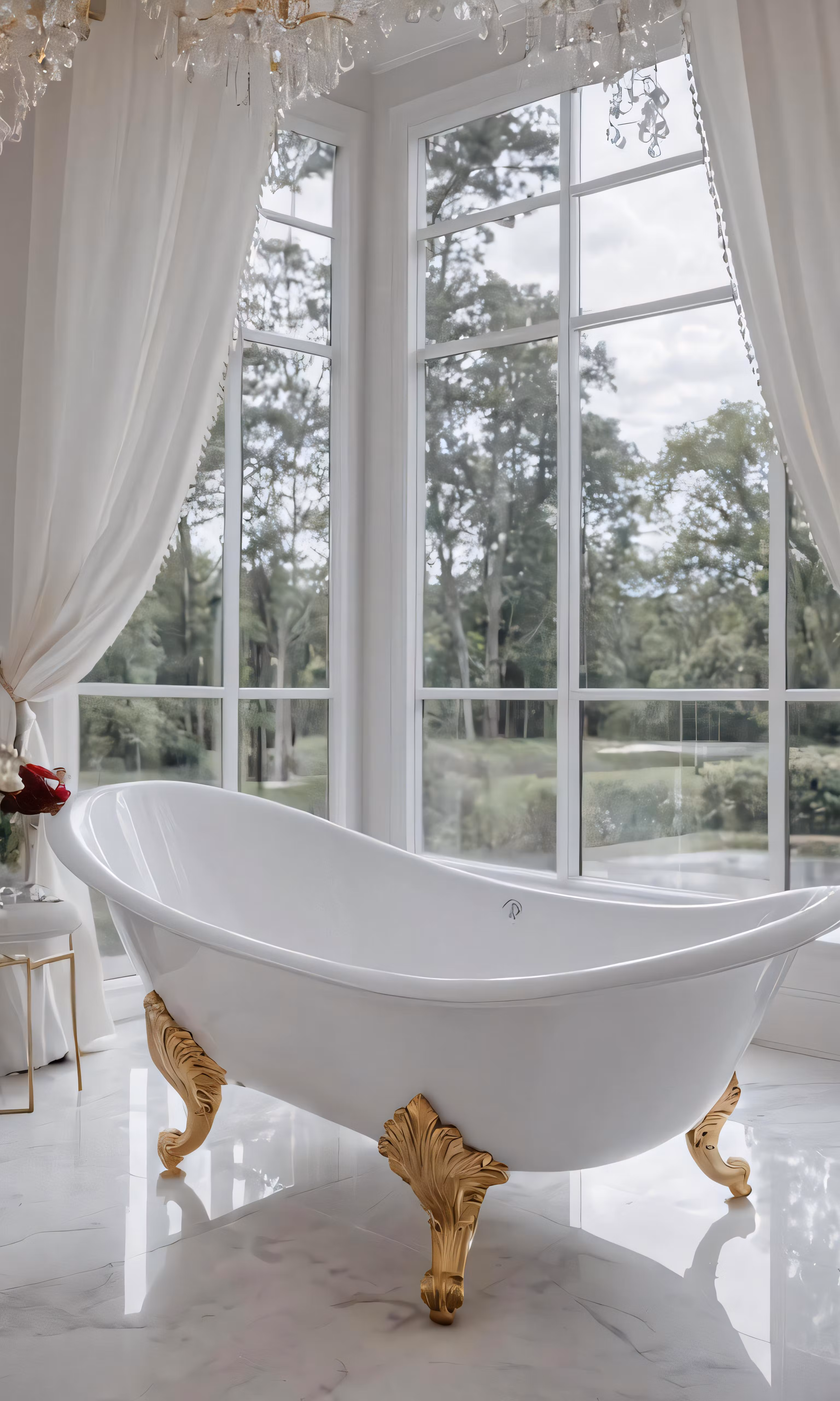 High resolution picture, free to use, an elegant bathroom with huge windows and a white bathtub