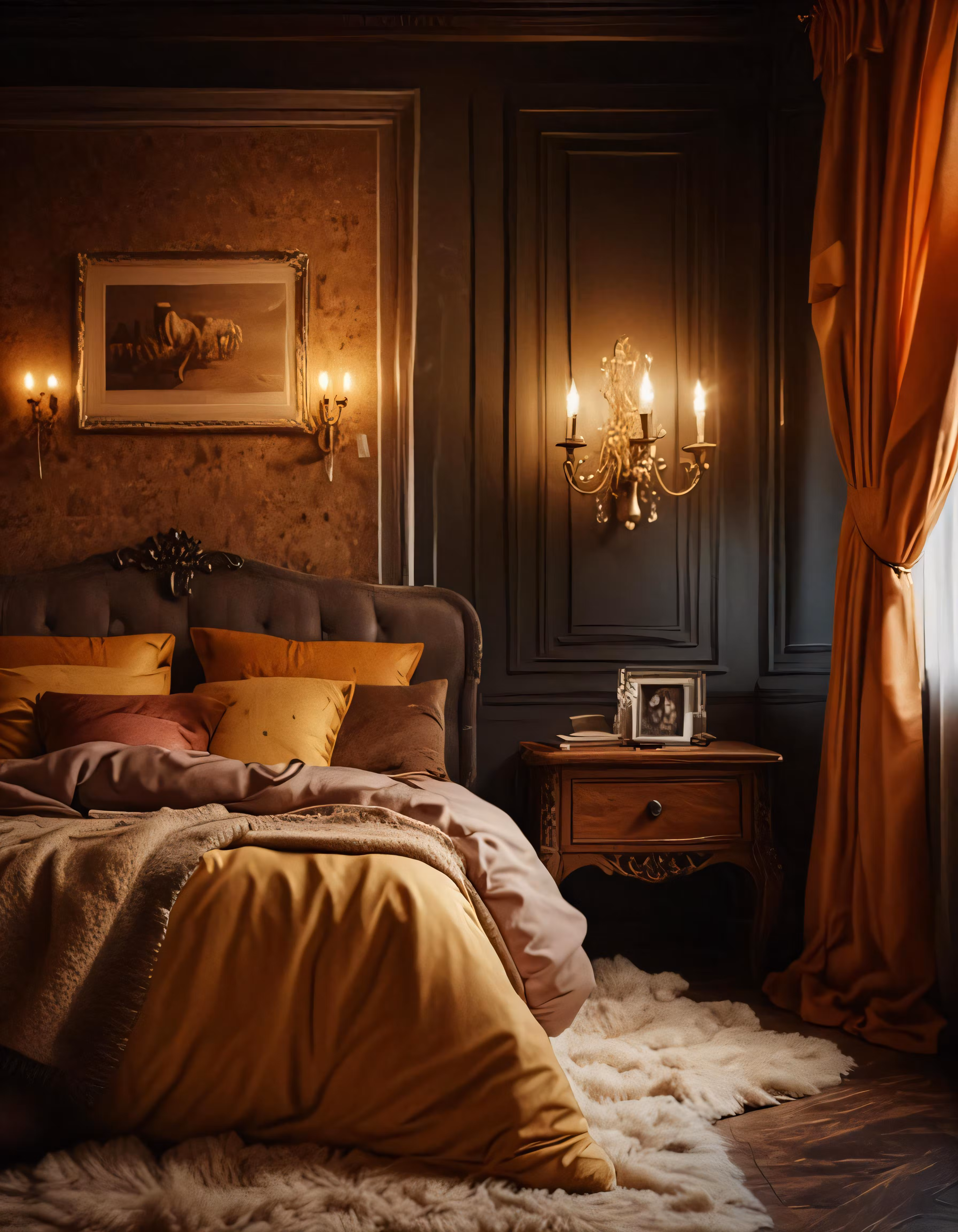 High resolution picture, free to use, an elegant bedroom is decorated in deep browns, soft golds and browns