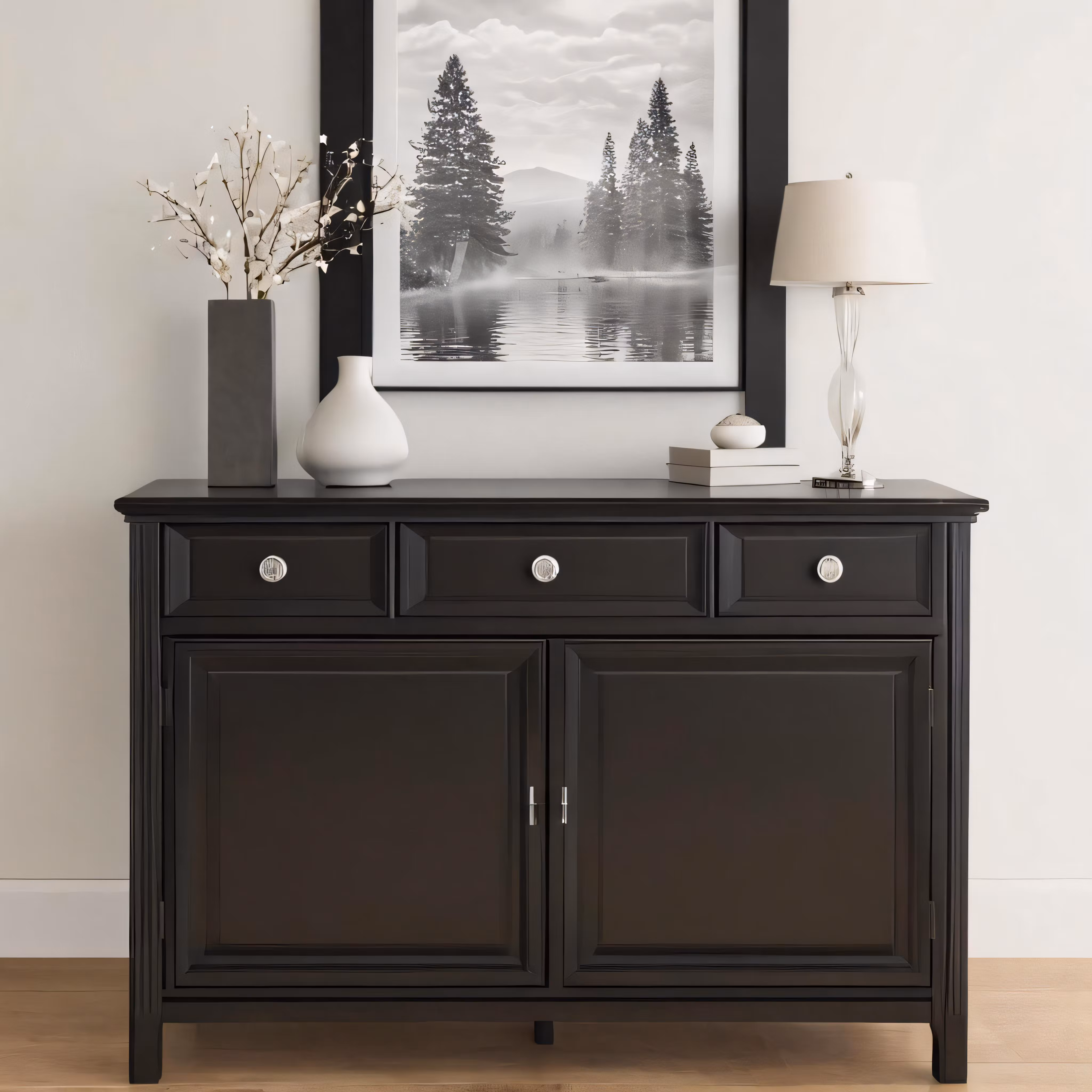High resolution picture, free to use, an elegant black buffet or server cabinet with an ornate glass vase and a landscape in a frame