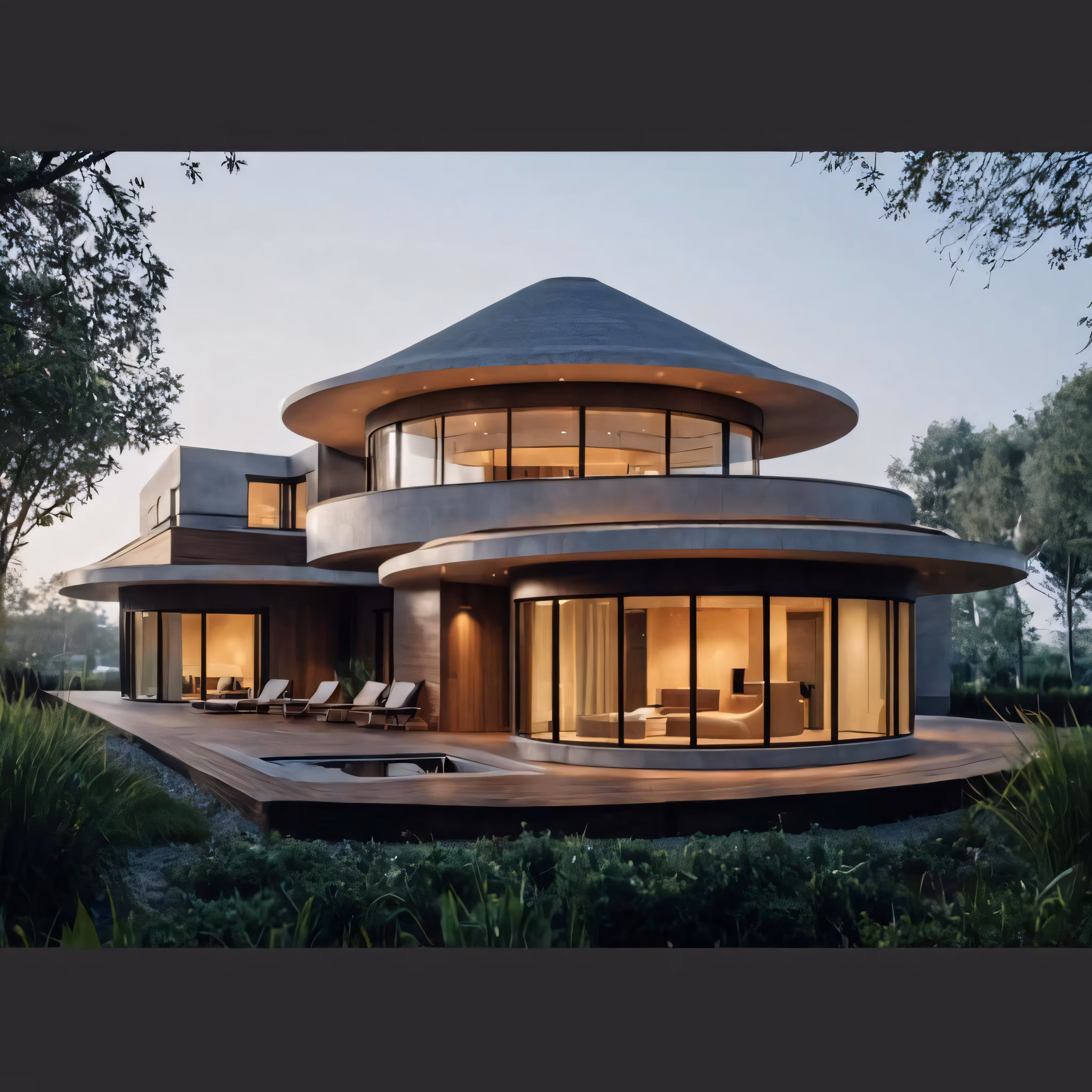 High resolution picture, free to use, an elegant circular building with a pool in the foreground