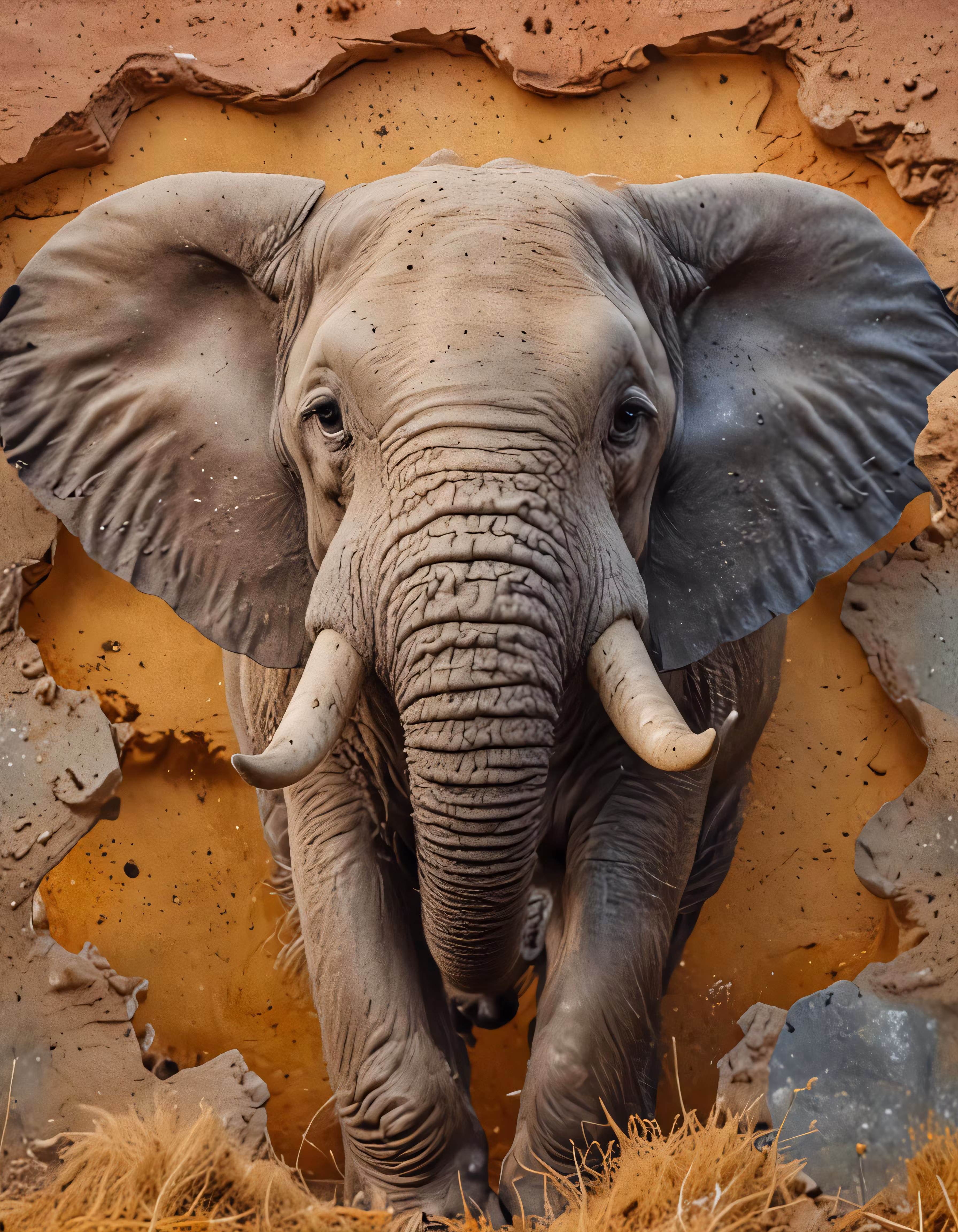 High resolution picture, free to use, an elephant with big tusks and big ears is standing near a stone wall