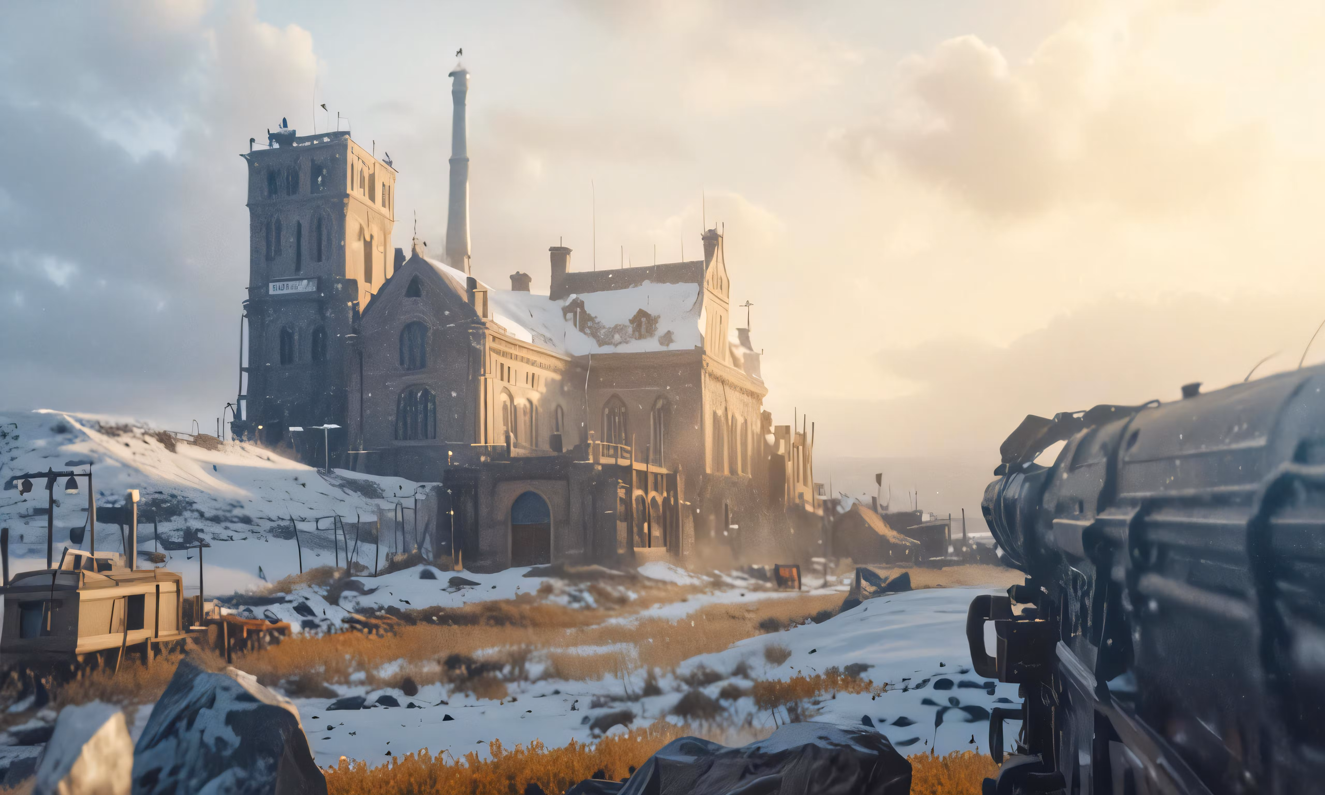 High resolution picture, free to use, an empty city on a cloudy day surrounded by mountains and snow