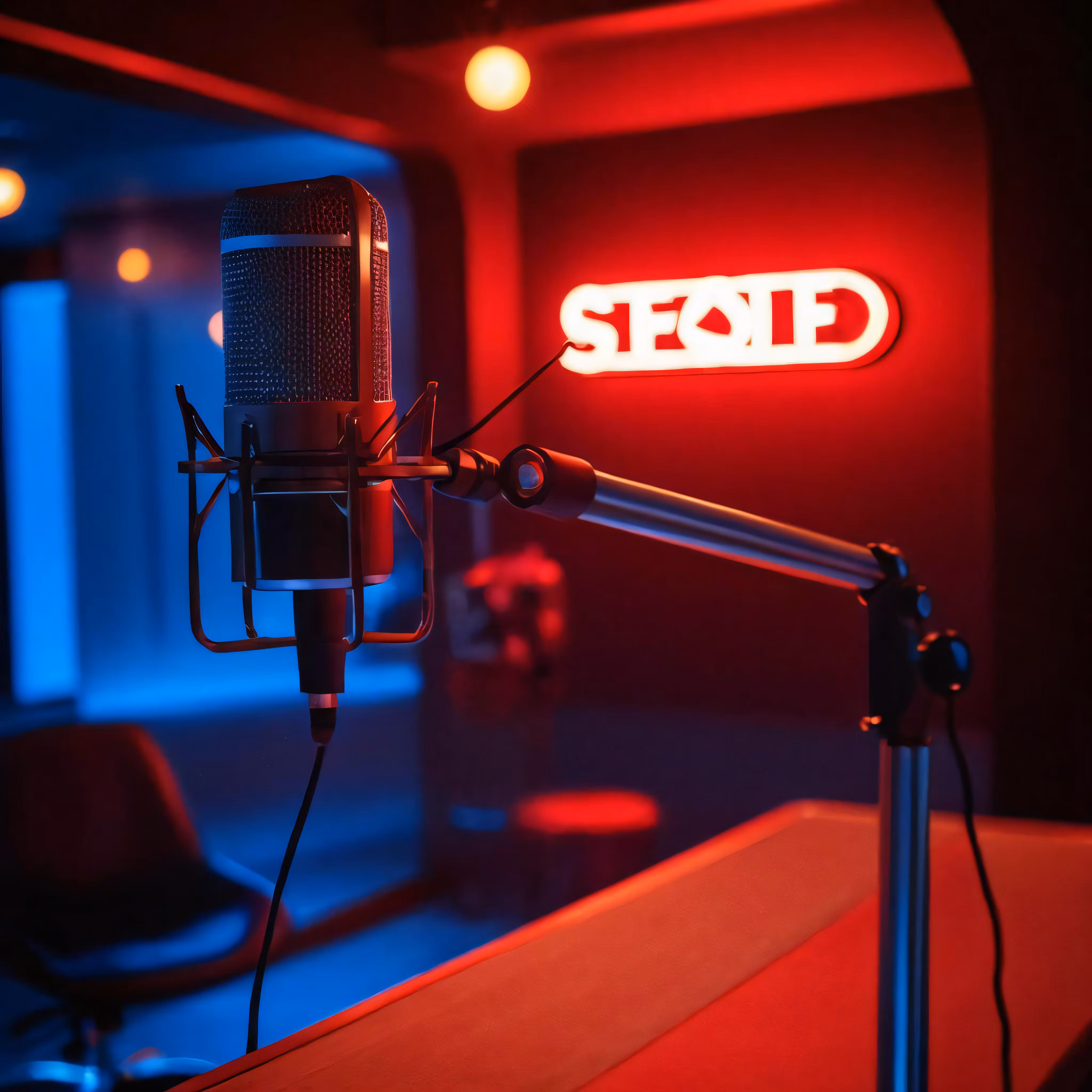 High resolution picture, free to use, an empty radio studio with a red logo and a microphone on the stand