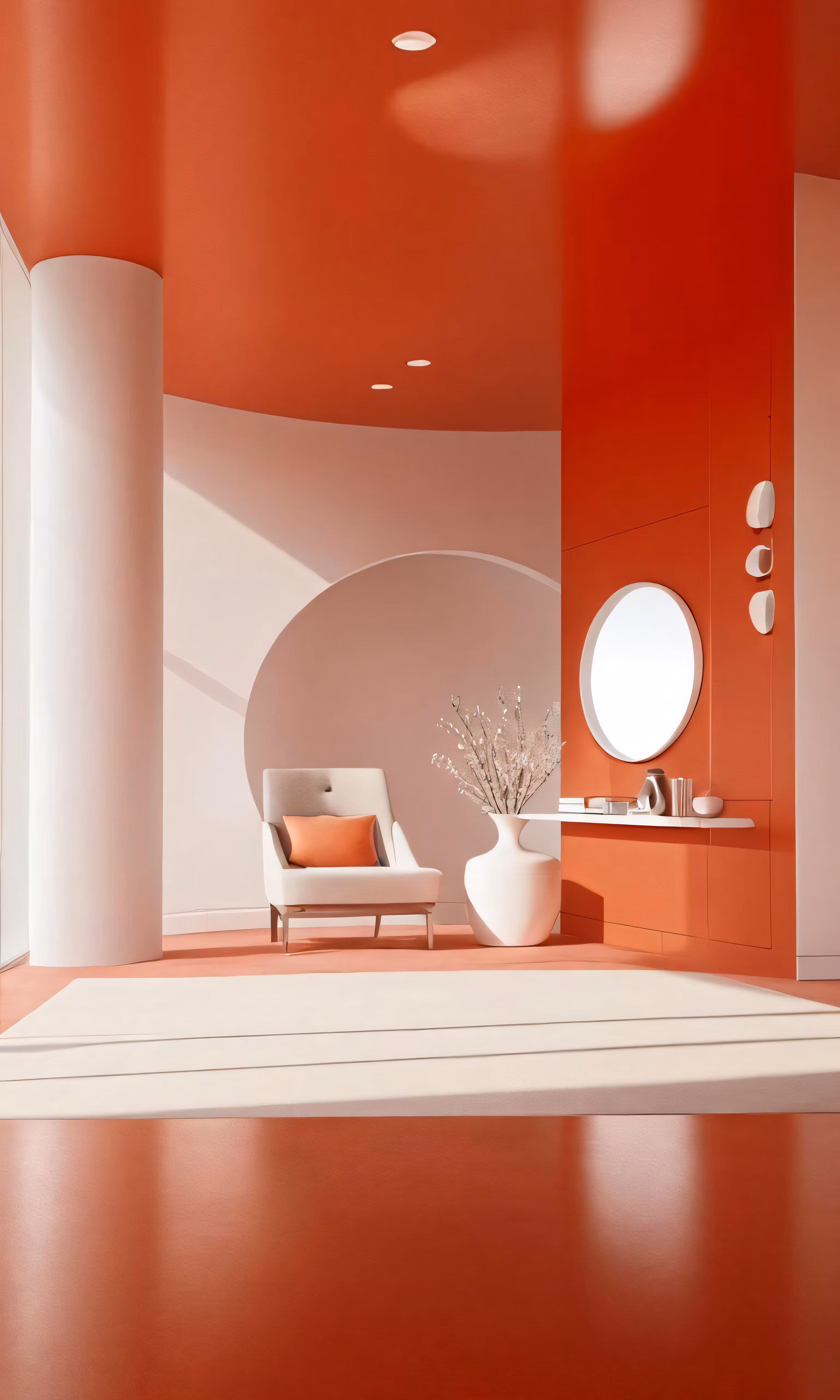 High resolution picture, free to use, an empty red room with furniture, a mirror and round orbs