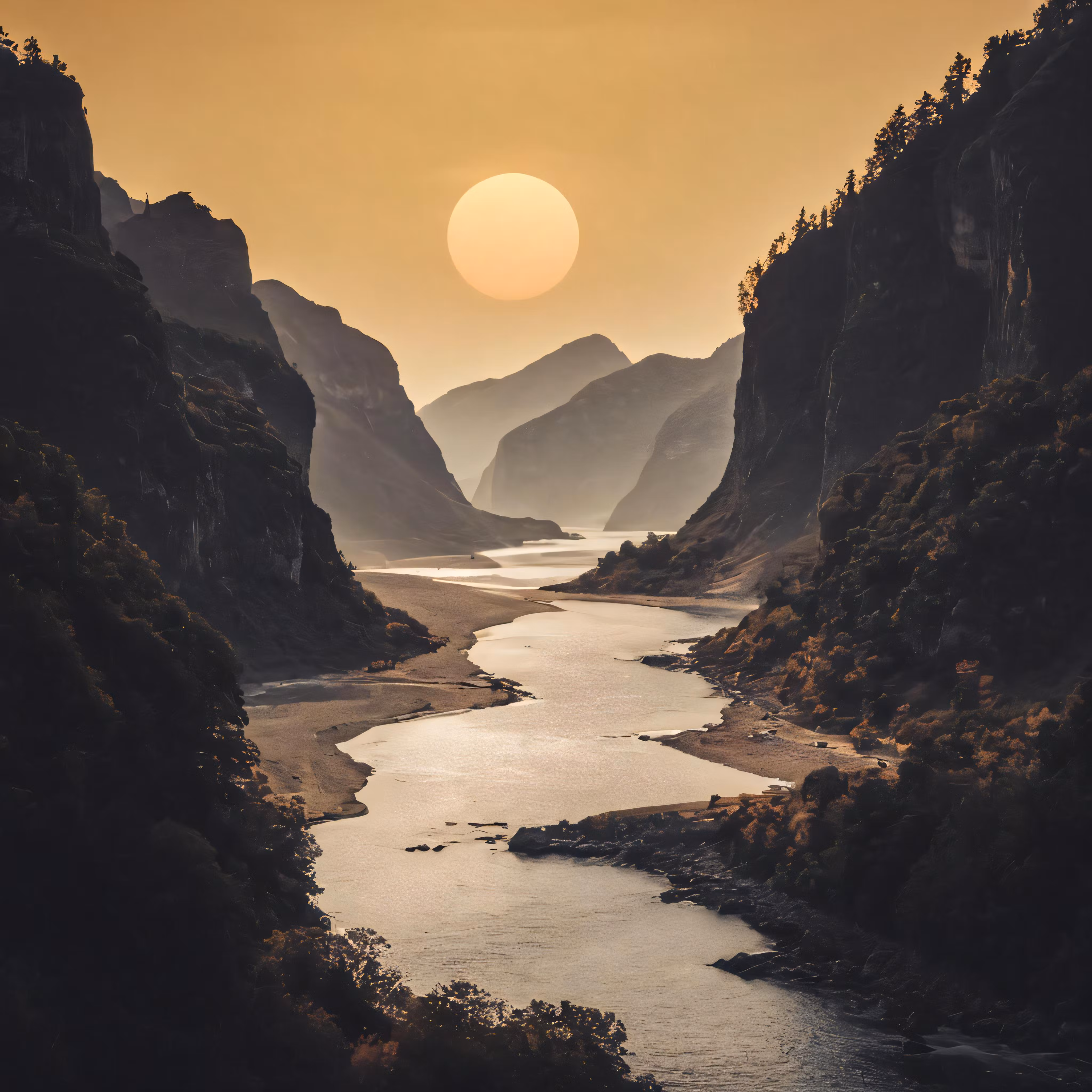 High resolution picture, free to use, an empty river surrounded by mountains is seen under the sun