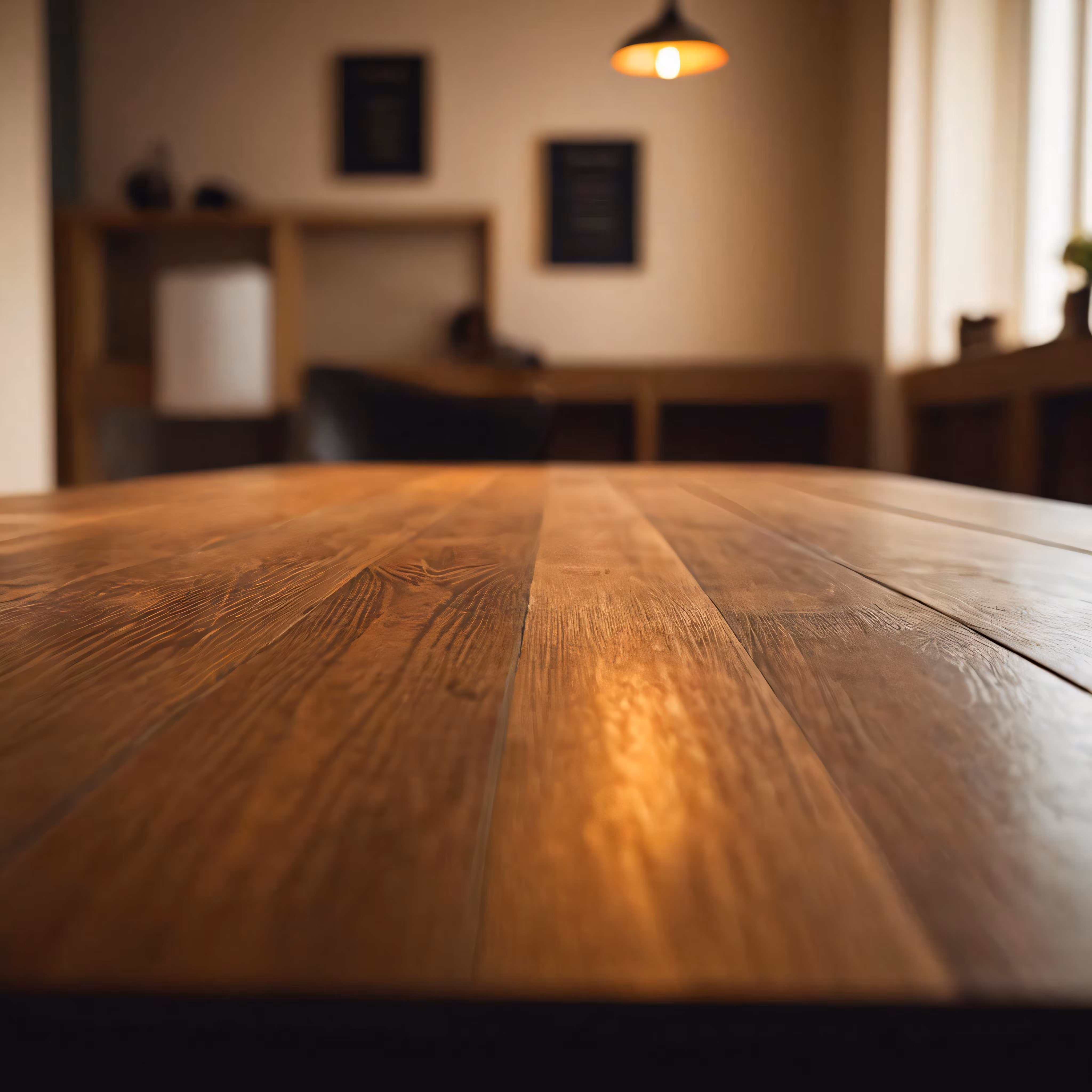 High resolution picture, free to use, an empty wooden table in a room with two lamps