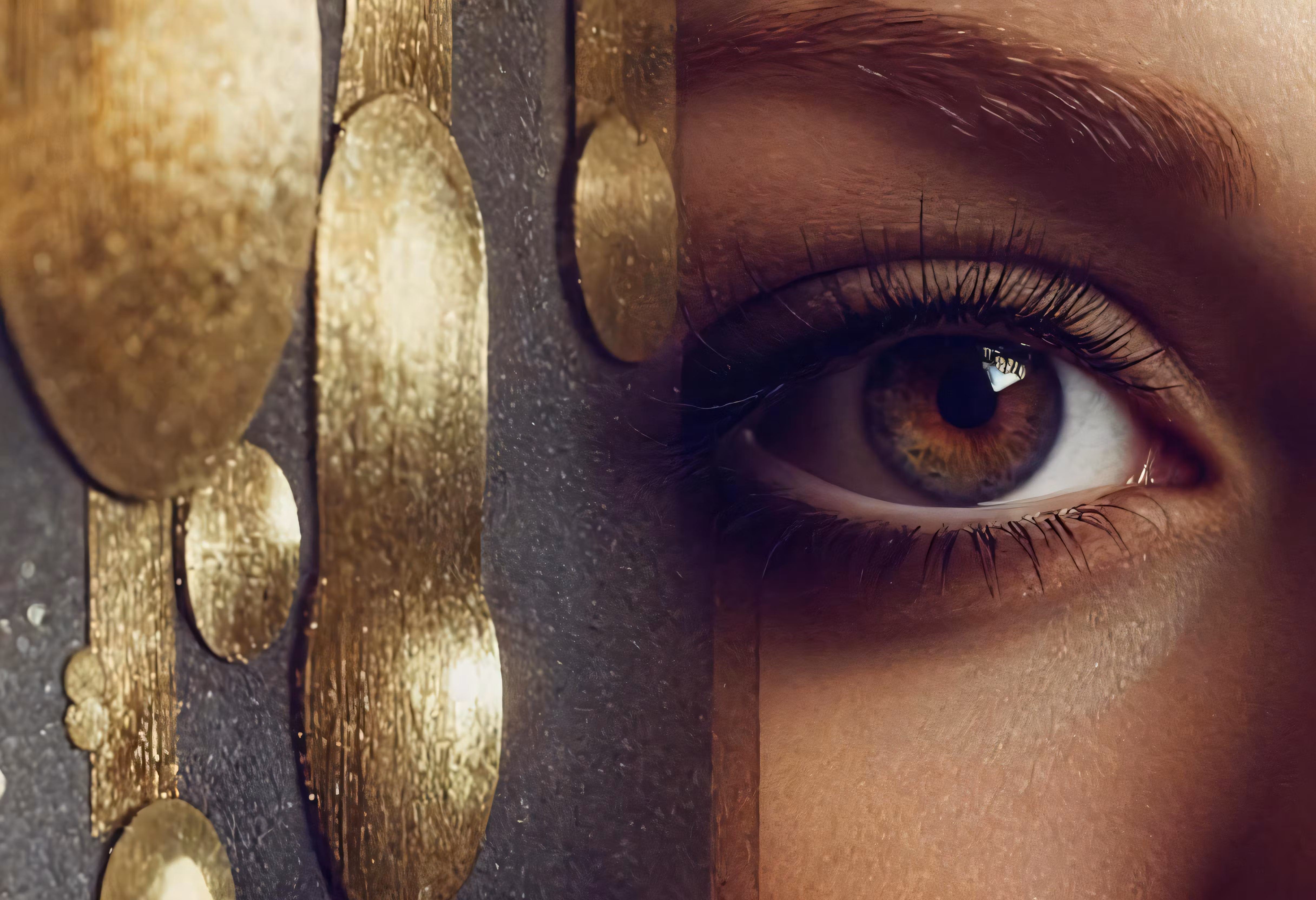 High resolution picture, free to use, an eye with gold details, with the image in the middle